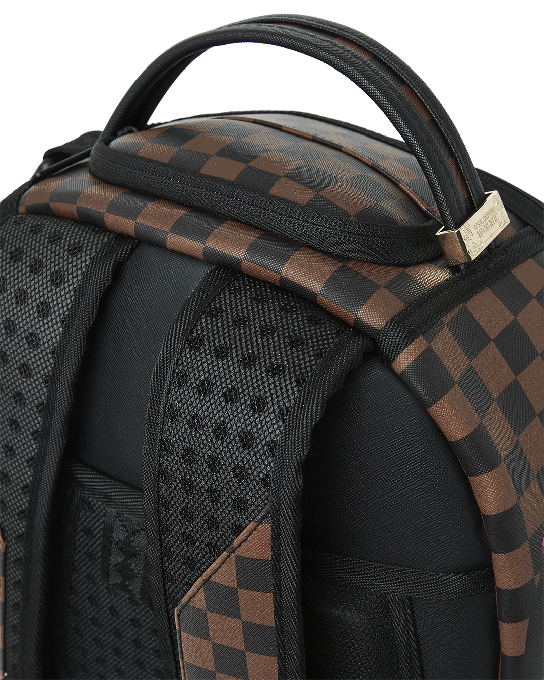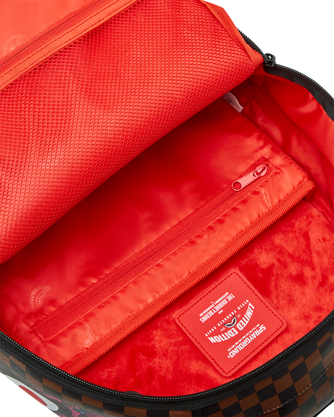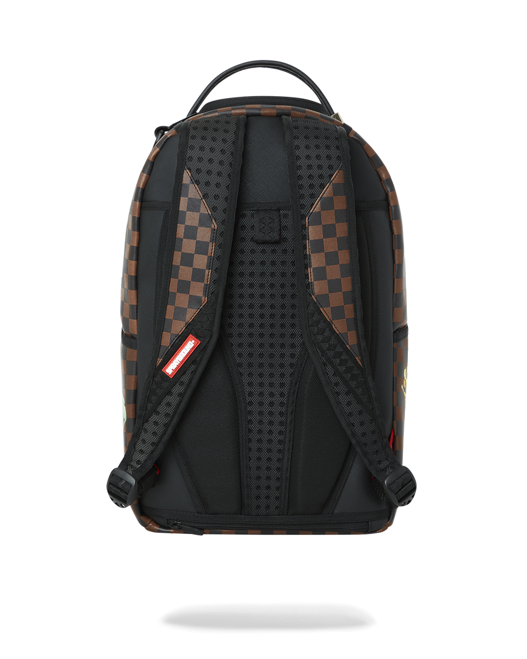 Dimensions: 18" x 6" x 11.5" • Front zipper pocket • Side pockets • Zippered Stash pocket • Separate velour sunglass compartment • Ergonomic mesh back padding • Adjustable Straps for custom sizing • Gold zippers with metal hardware • Metal "Sprayground Authentic" badge • Slide through back sleeve connects to carry-on luggage to free your hands