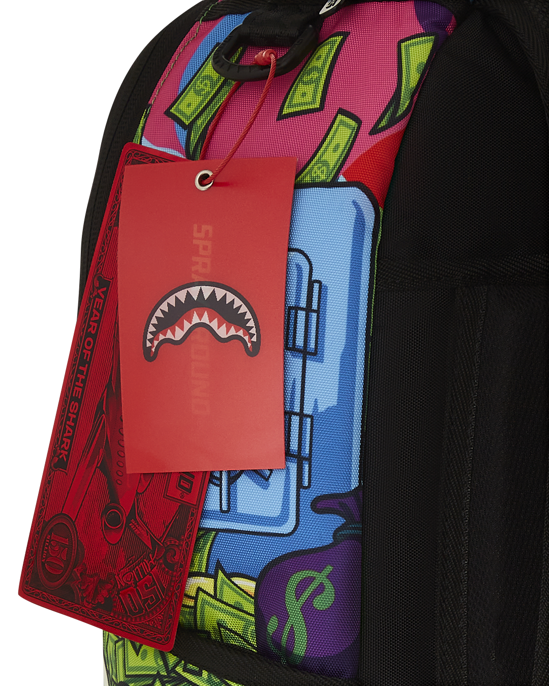 Dimensions: 18" x 6" x 11.5" • Front zipper pocket • Side pockets • Zippered Stash pocket • Separate velour sunglass compartment • Ergonomic mesh back padding • Adjustable Straps for custom sizing • Gold zippers with metal hardware • Metal "Sprayground Authentic" badge • Slide through back sleeve connects to carry-on luggage to free your hands