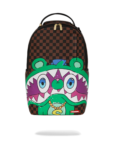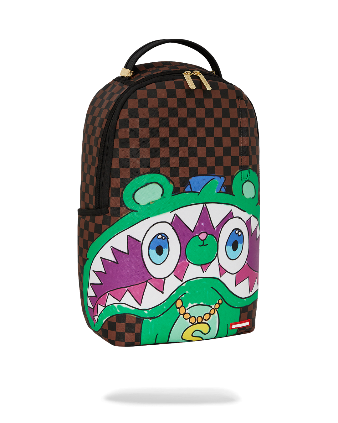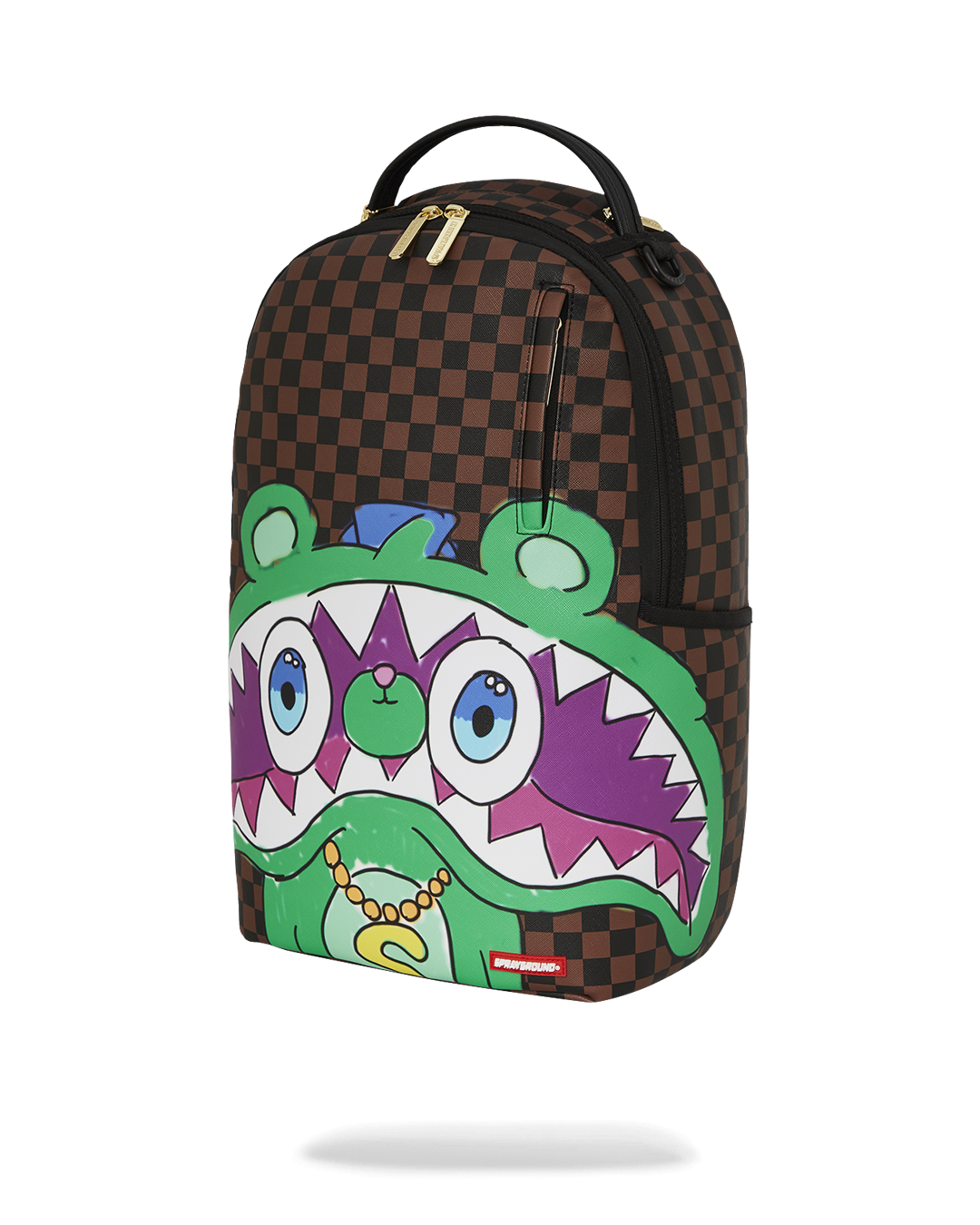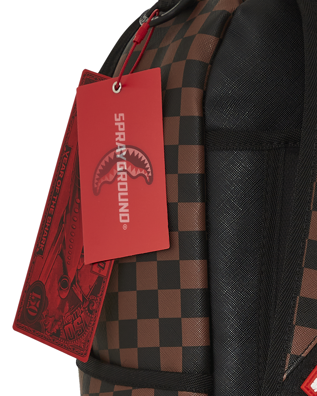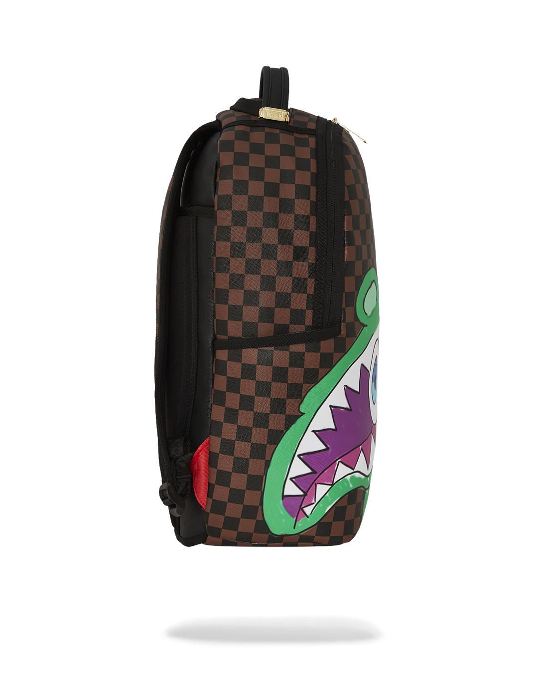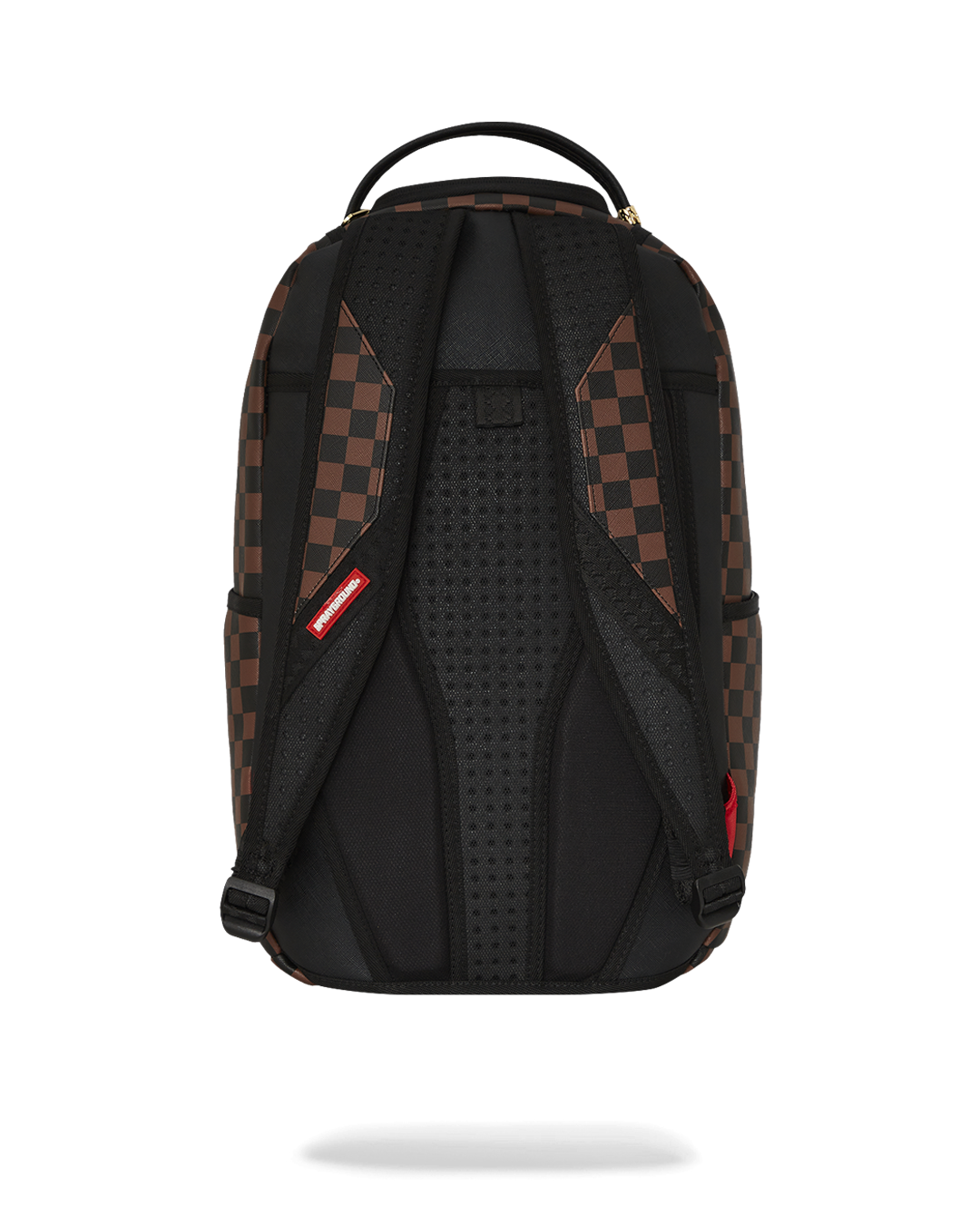 Dimensions: 18" x 6" x 11.5" • Front zipper pocket • Side pockets • Zippered Stash pocket • Separate velour sunglass compartment • Ergonomic mesh back padding • Adjustable Straps for custom sizing • Gold zippers with metal hardware • Metal "Sprayground Authentic" badge • Slide through back sleeve connects to carry-on luggage to free your hands