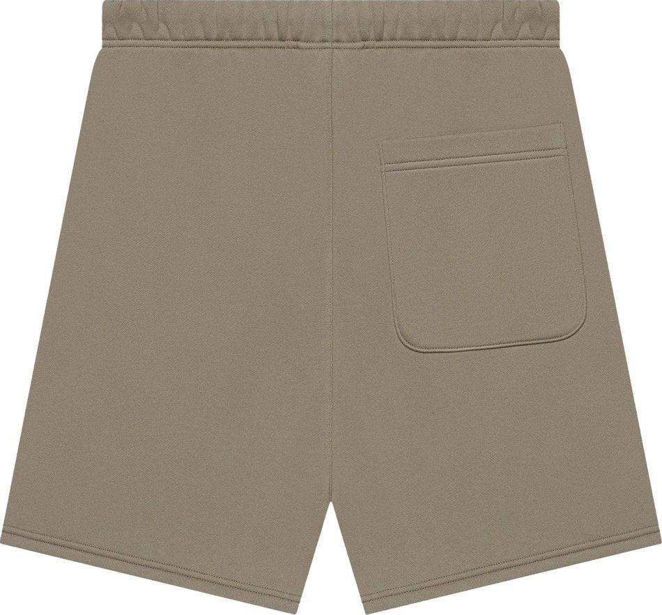 The signature Essentials shorts is updated with a flocked logo treatment inspired by vintage athletic sweats. A shiny Essentials Fear of God logo is on the left leg, and an Essentials rubberized label is stitched on the center front.