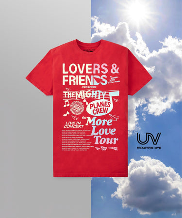 This tee features a UV light-reactive print that, when hit with sunlight, changes the solid color print to shades of pink, blue, and cream.