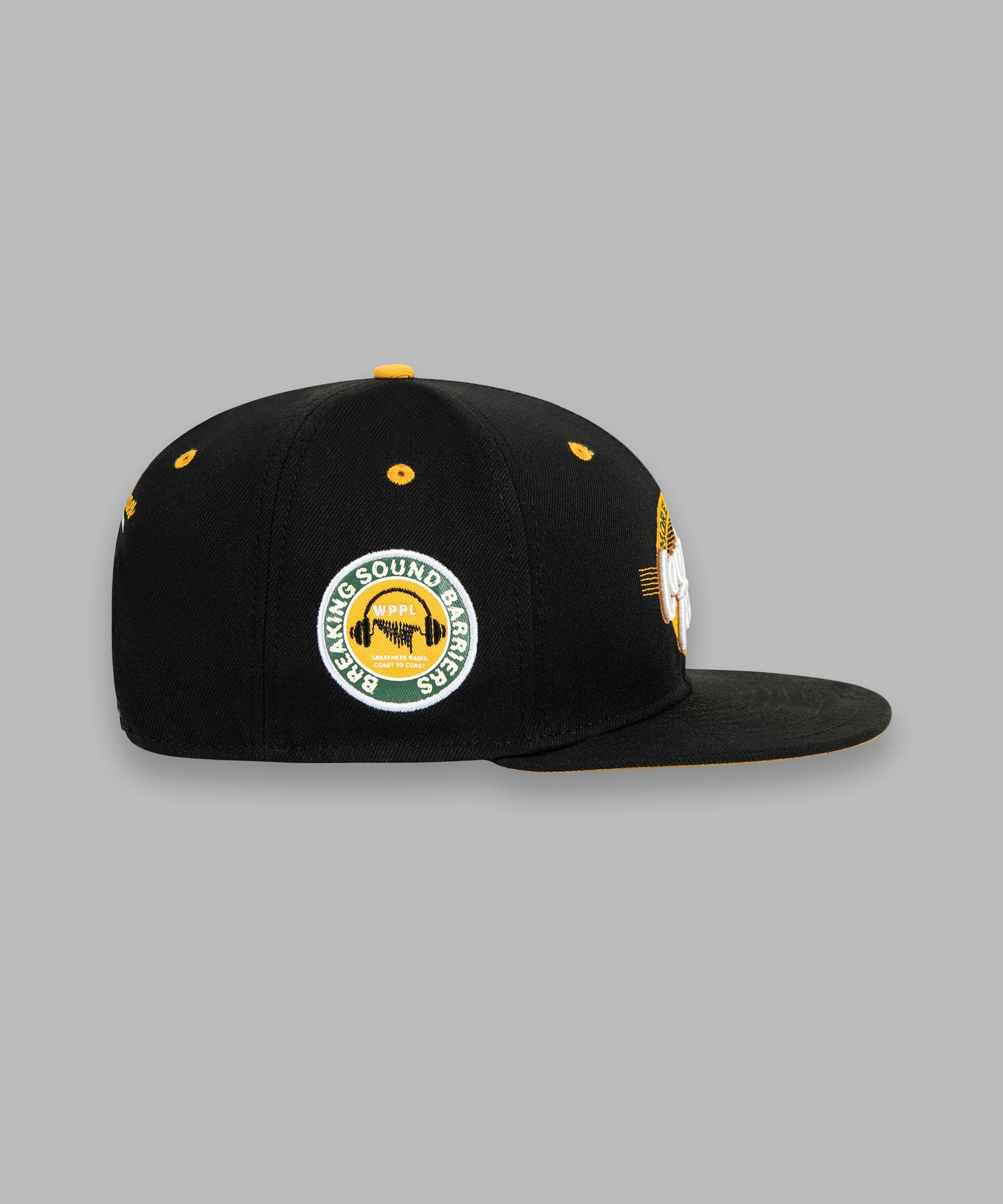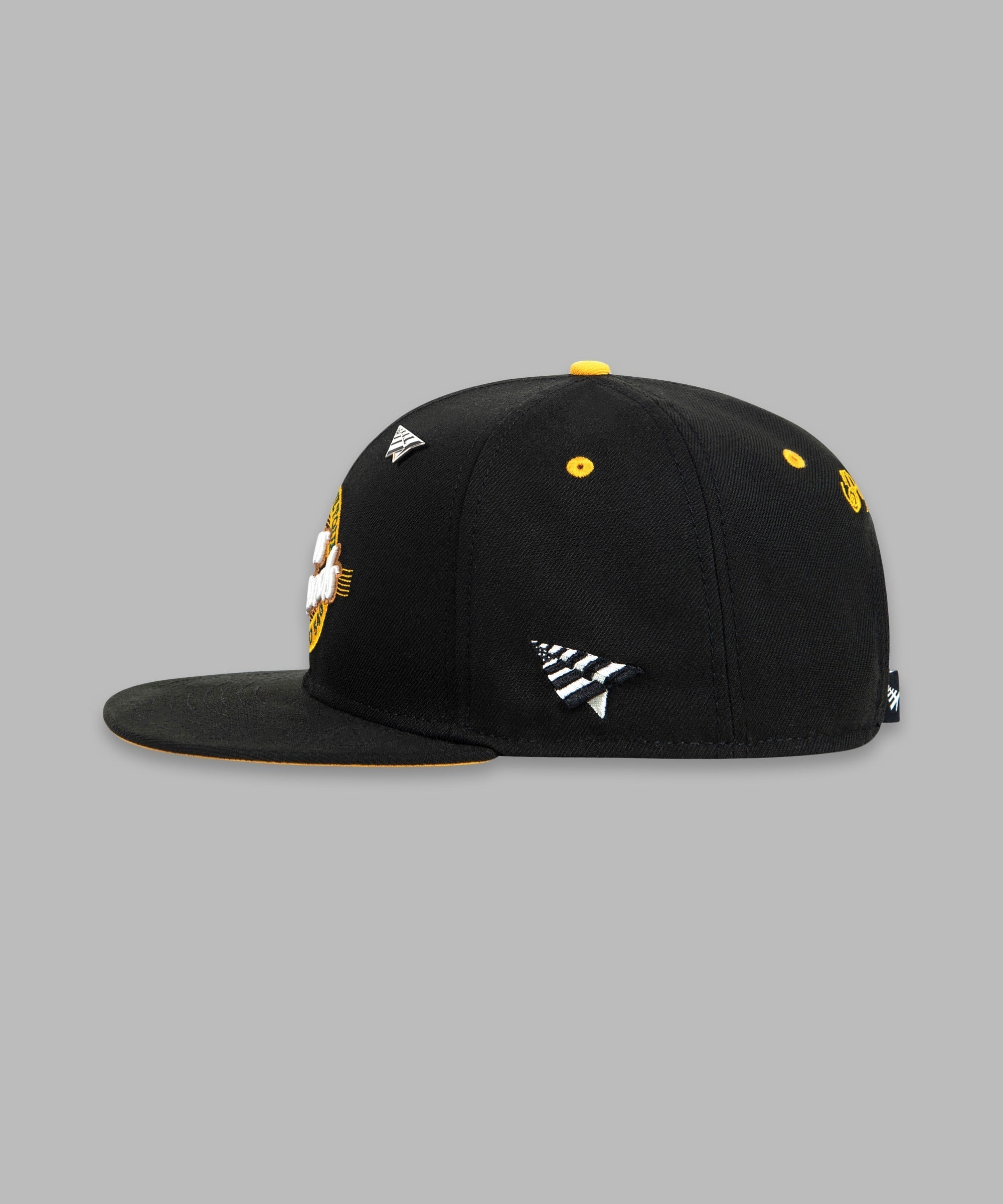 This classic snapback style offers visual interest at every angle: colorful embroideries all around, contrast eyelets, contrast undervisor, and a metal Plane pin on the crown.