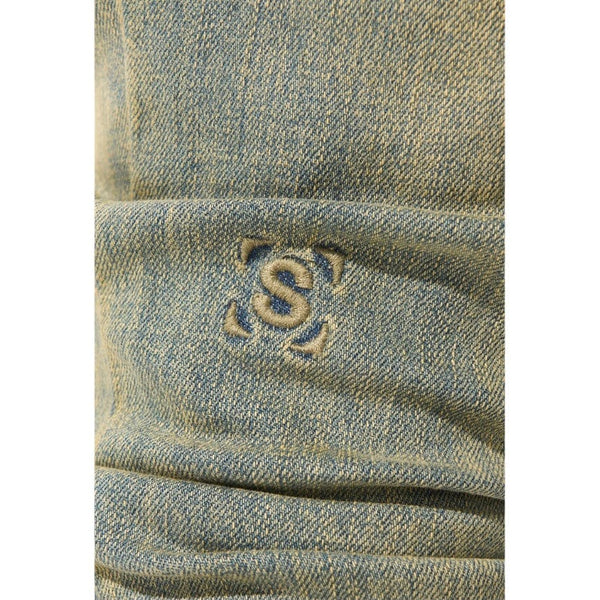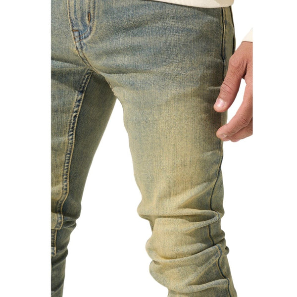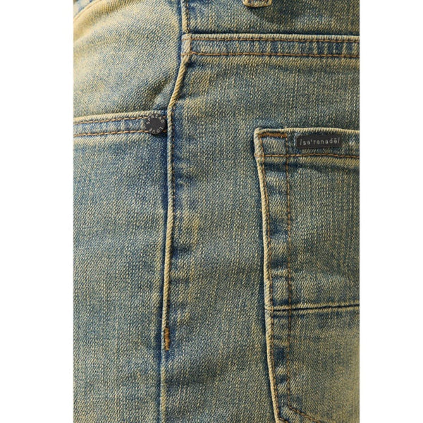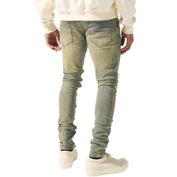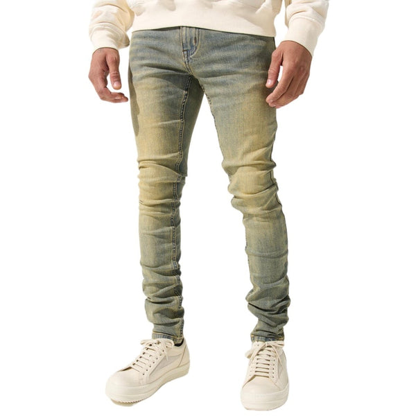 The "OSETRA" jeans feature a vintage earth wash with a skinny fit. Yellow overdyed with fading throughout. Five-pocket styling. Leather logo patch at back waistband. Zip-fly. Tonal stitching. 5 1/2" W leg opening. SERENEDE® branded button and rivet hardware.