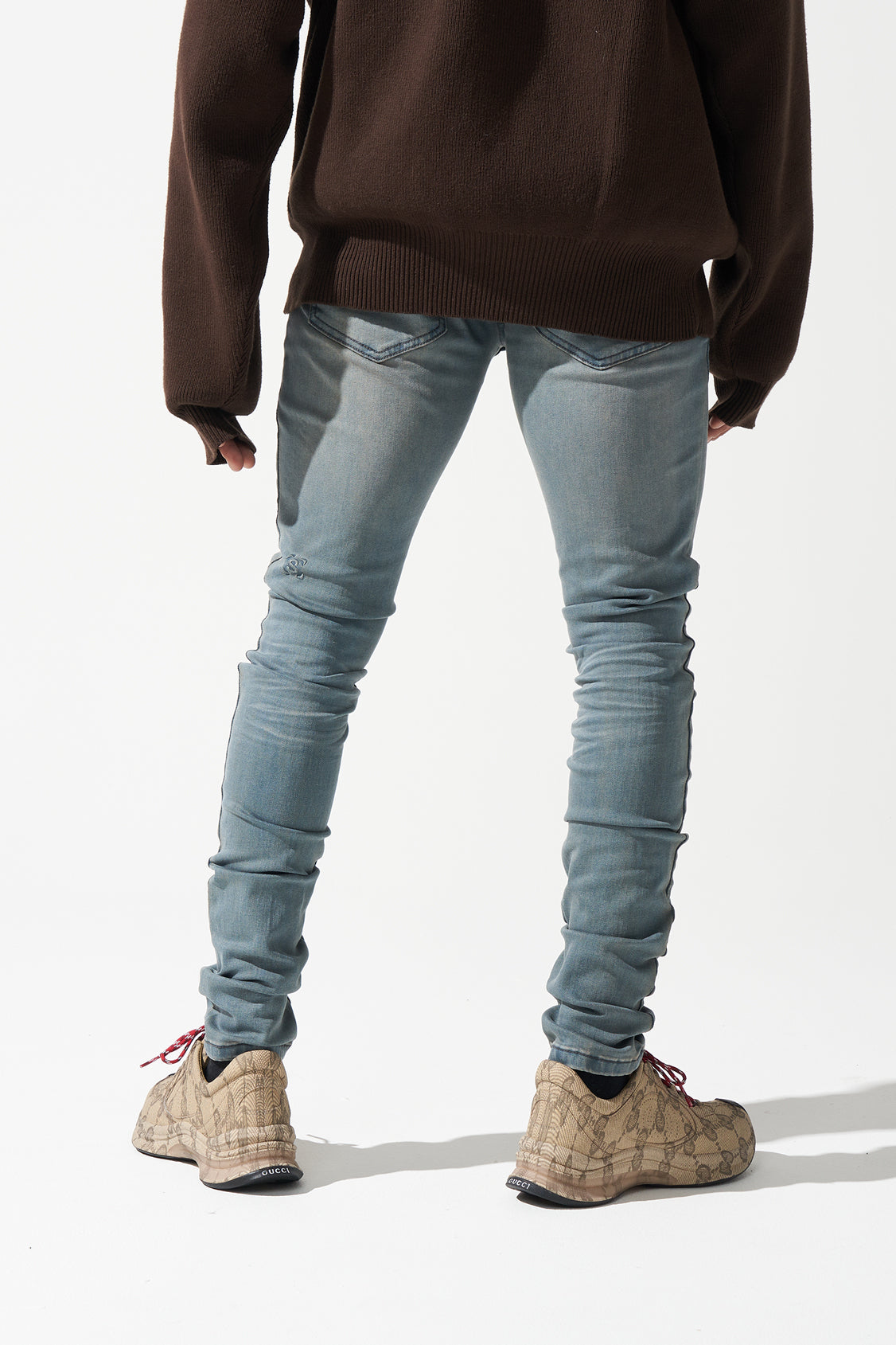 The "SEAFOAM" jeans feature a slate blue wash. 4-way stretch. Fading and distressing throughout. Our signature skinny silhouette --- fitted from the waist straight down to the ankle. Five-pocket styling. Leather logo patch at back waistband. Zip-fly. 5 1/2" W leg opening. SERENEDE® branded buttons and rivet hardware accents.