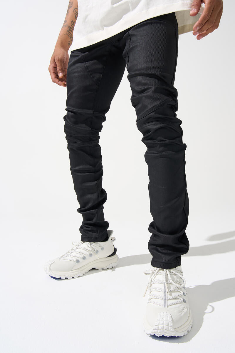 The "moto" jeans feature a jet-black wash with a skinny fit. Our go-to for black skinny jeans. Stretch for comfort. Distressing throughout. Skinny fit silhouette --- fitted from the waist straight down to the ankle. Five-pocket styling. Leather logo patch at back waistband. Zip-fly. 5 1/2" W leg opening. SERENEDE® branded buttons and rivet hardware accents.