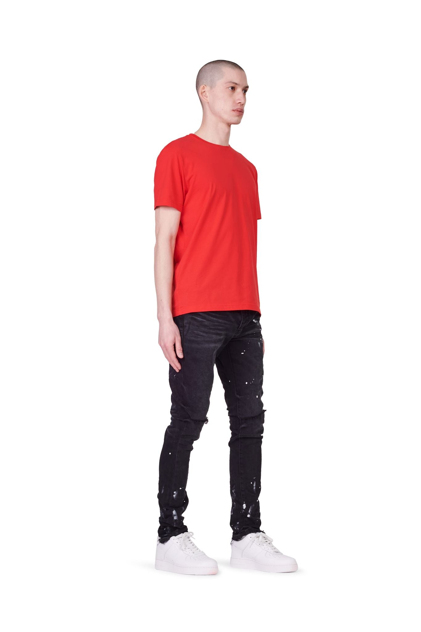 Constructed in a vintage black wash, this elevated denim is designed with blowout detailing at the knee, hand-applied paint splatter, and a 3D wrinkle treatment for a distressed and vintage feel.