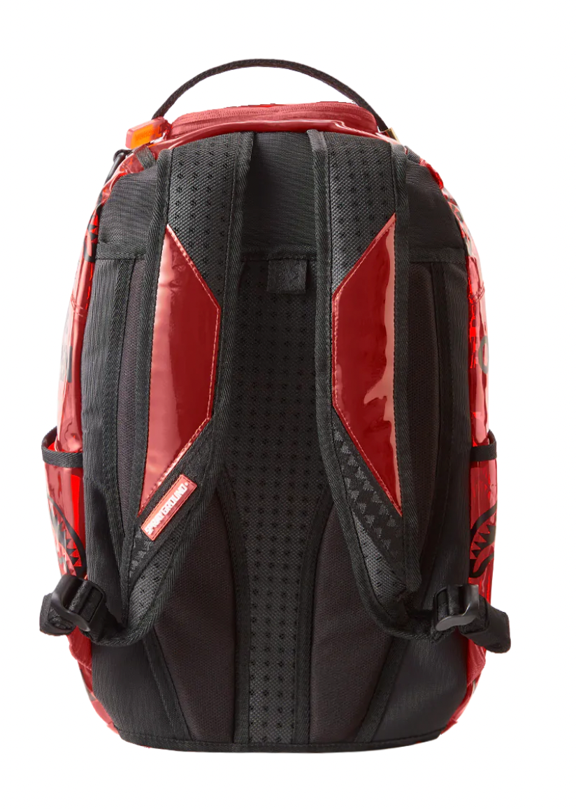 Dimensions: 18" x 6" x 11.5" • Front zipper pocket • Side pockets • Zippered Stash pocket • Separate Velour sunglass compartment • Ergonomic mesh back padding • Adjustable Straps for custom sizing • Gold zippers with metal hardware • Metal "Sprayground Authentic" badge • Slide through back sleeve connects to carry-on luggage to free your hands