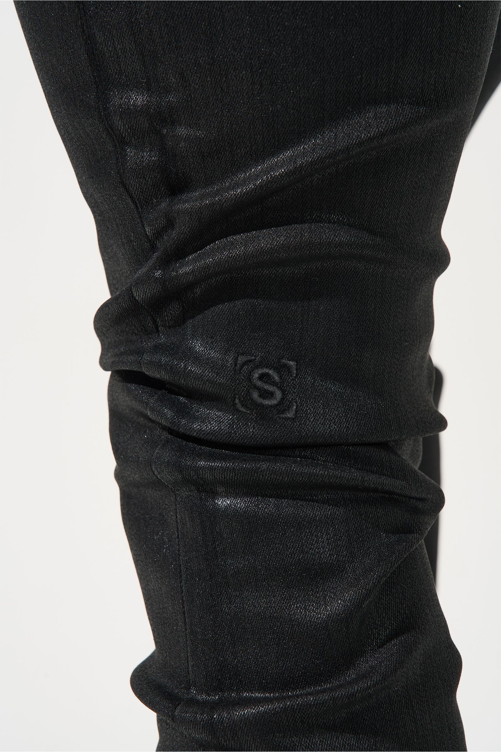 SERENEDE® ONYX Stacked Jeans - Black denim with resin wax coating featuring signature stacked construction.