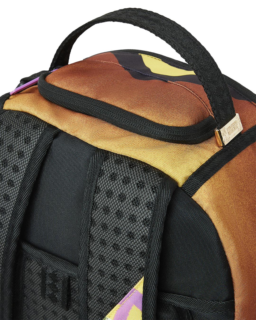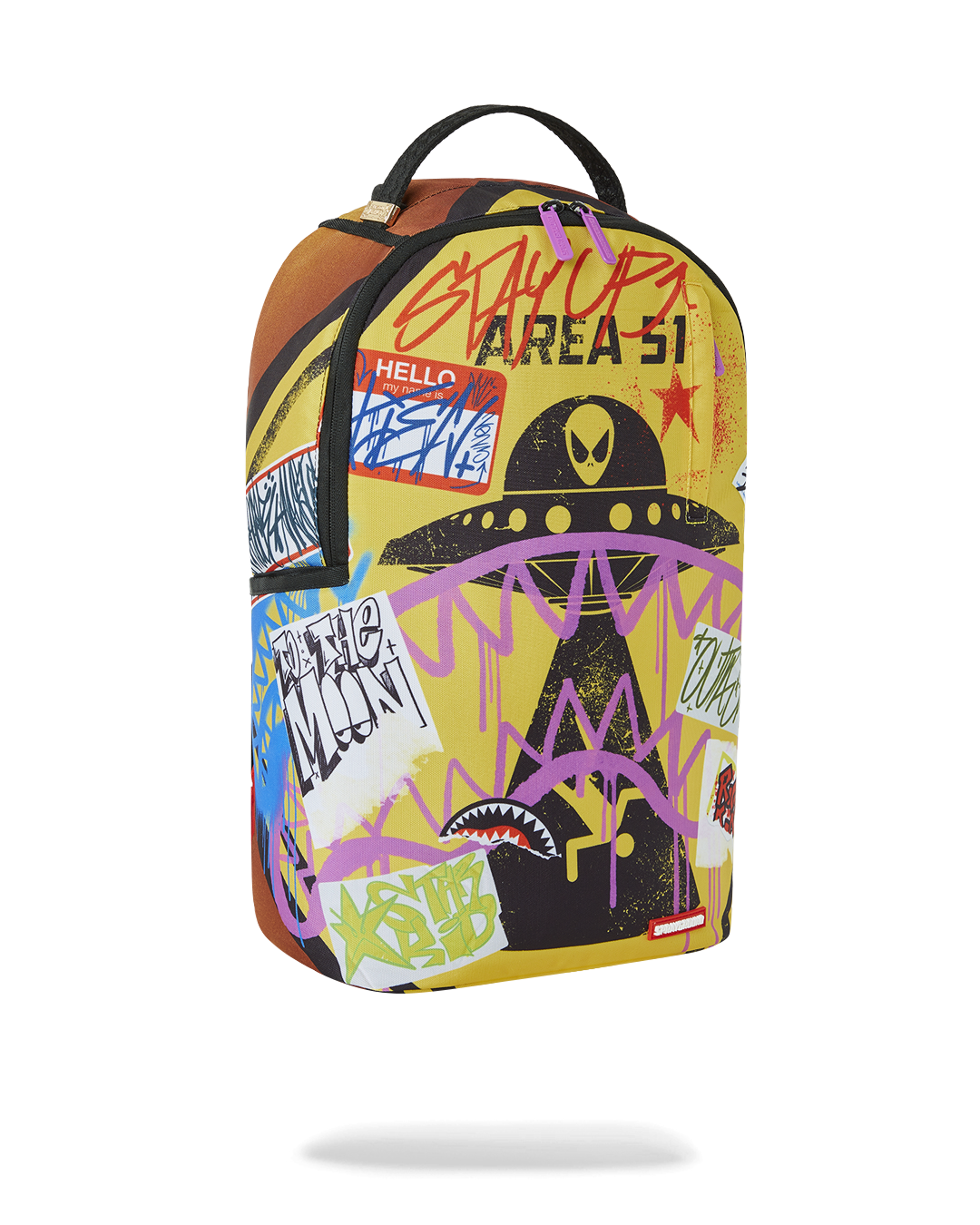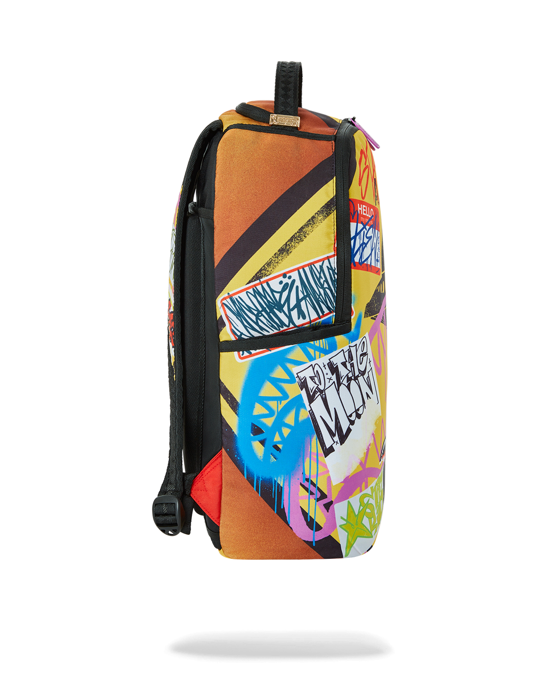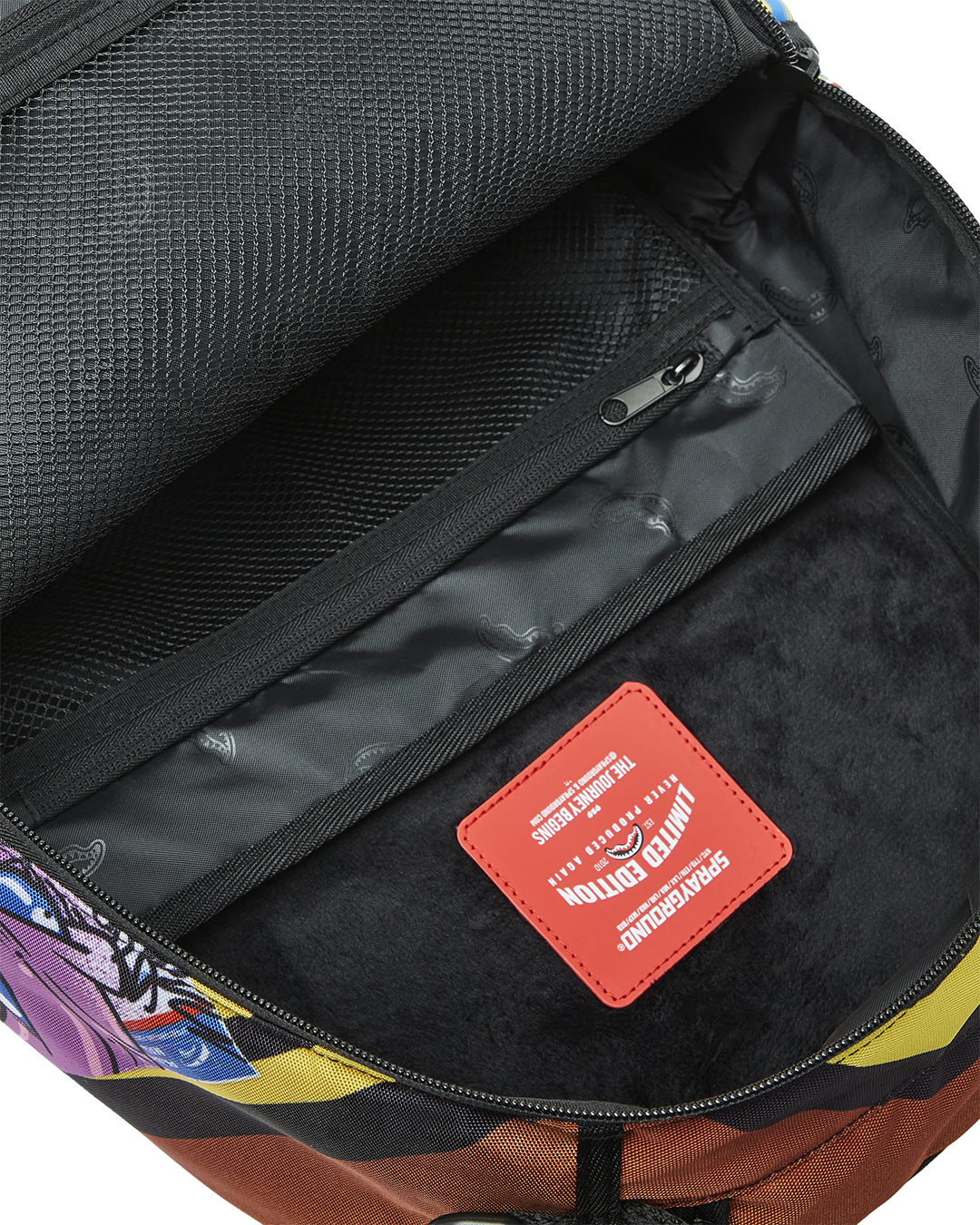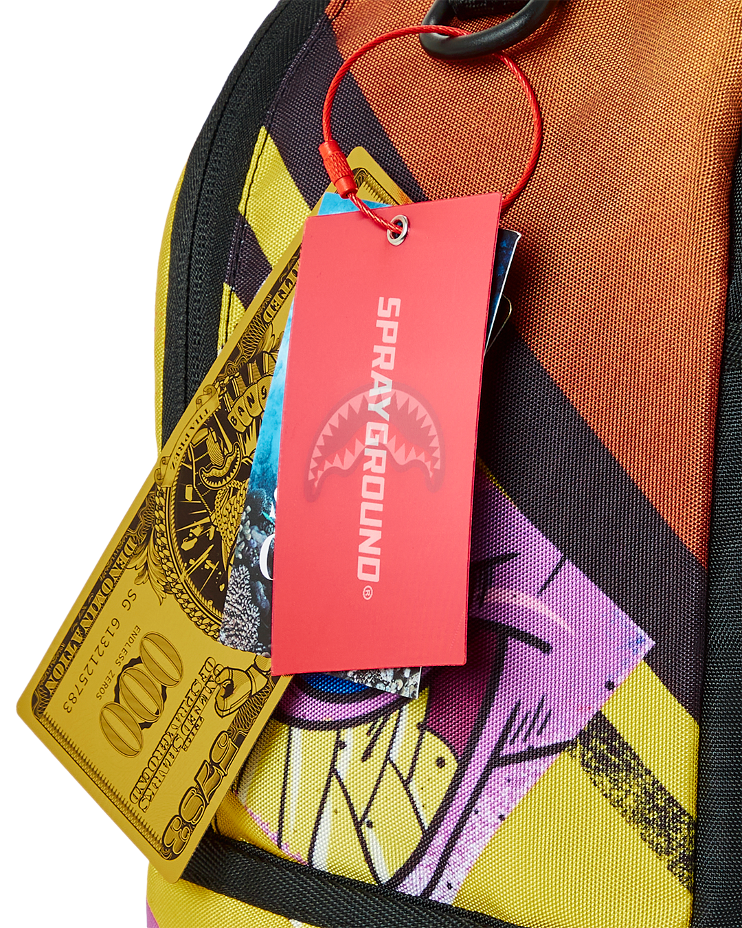 Dimensions: 18" x 6" x 11.5" • Front zipper pocket • Side pockets • Zippered Stash pocket • Separate velour sunglass compartment • Ergonomic mesh back padding • Adjustable Straps for custom sizing • Gold zippers with metal hardware • Metal "Sprayground Authentic" badge • Slide through back sleeve connects to carry-on luggage to free your hands