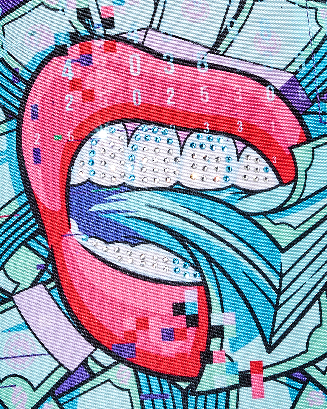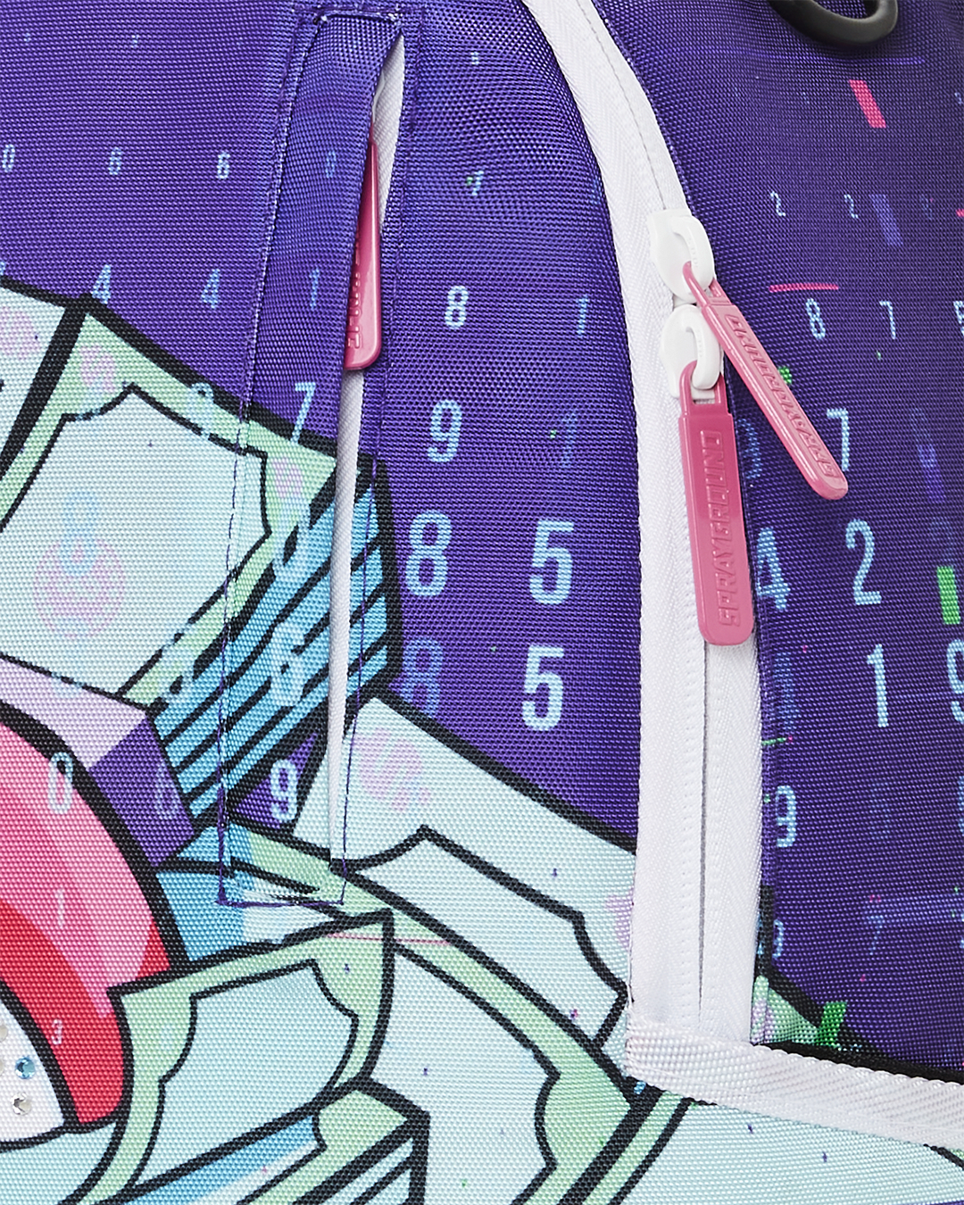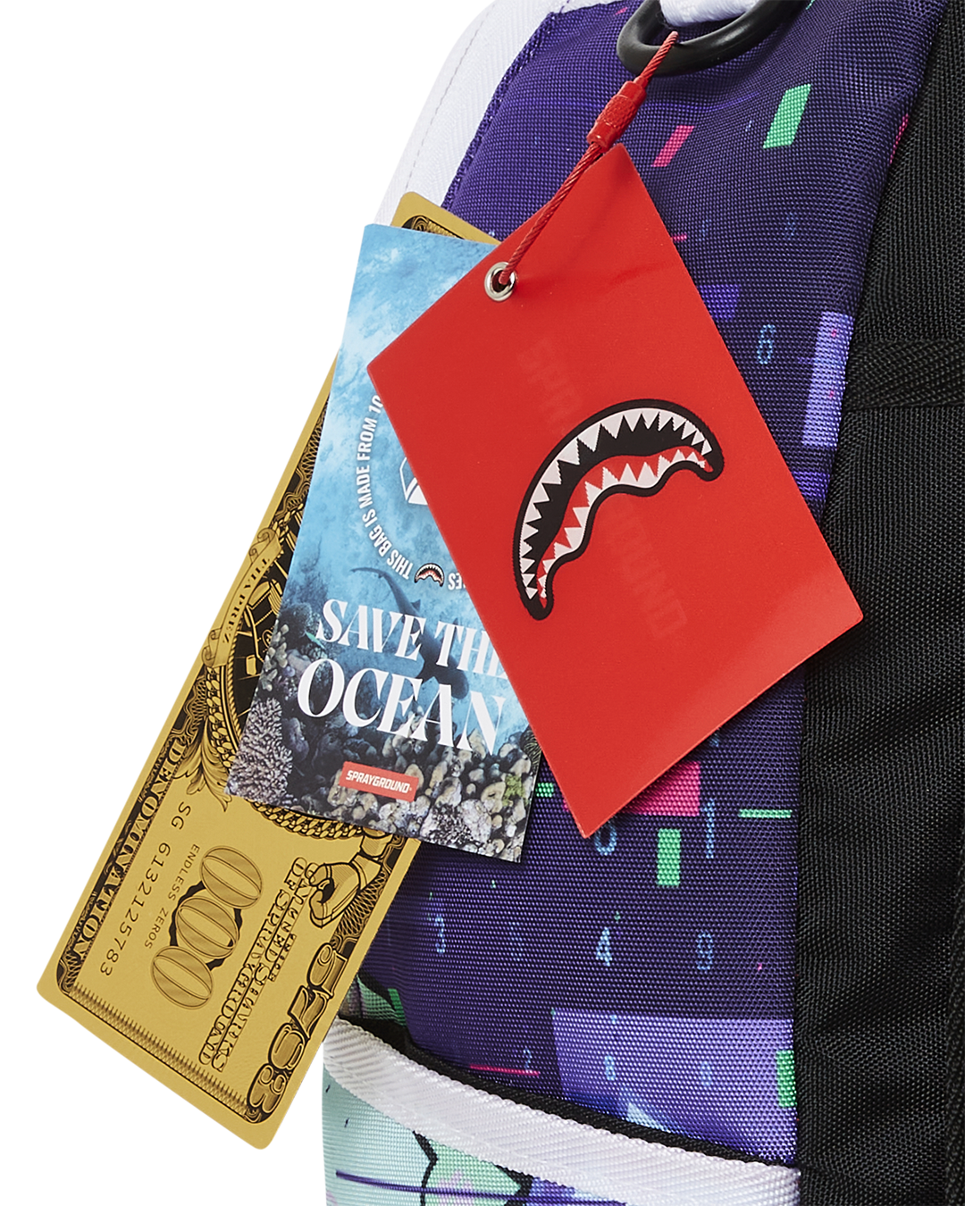 Dimensions: 18" x 6" x 11.5" • Front zipper pocket • Side pockets • Zippered Stash pocket • Separate velour sunglass compartment • Ergonomic mesh back padding • Adjustable Straps for custom sizing • Gold zippers with metal hardware • Metal "Sprayground Authentic" badge • Slide through back sleeve connects to carry-on luggage to free your hands
