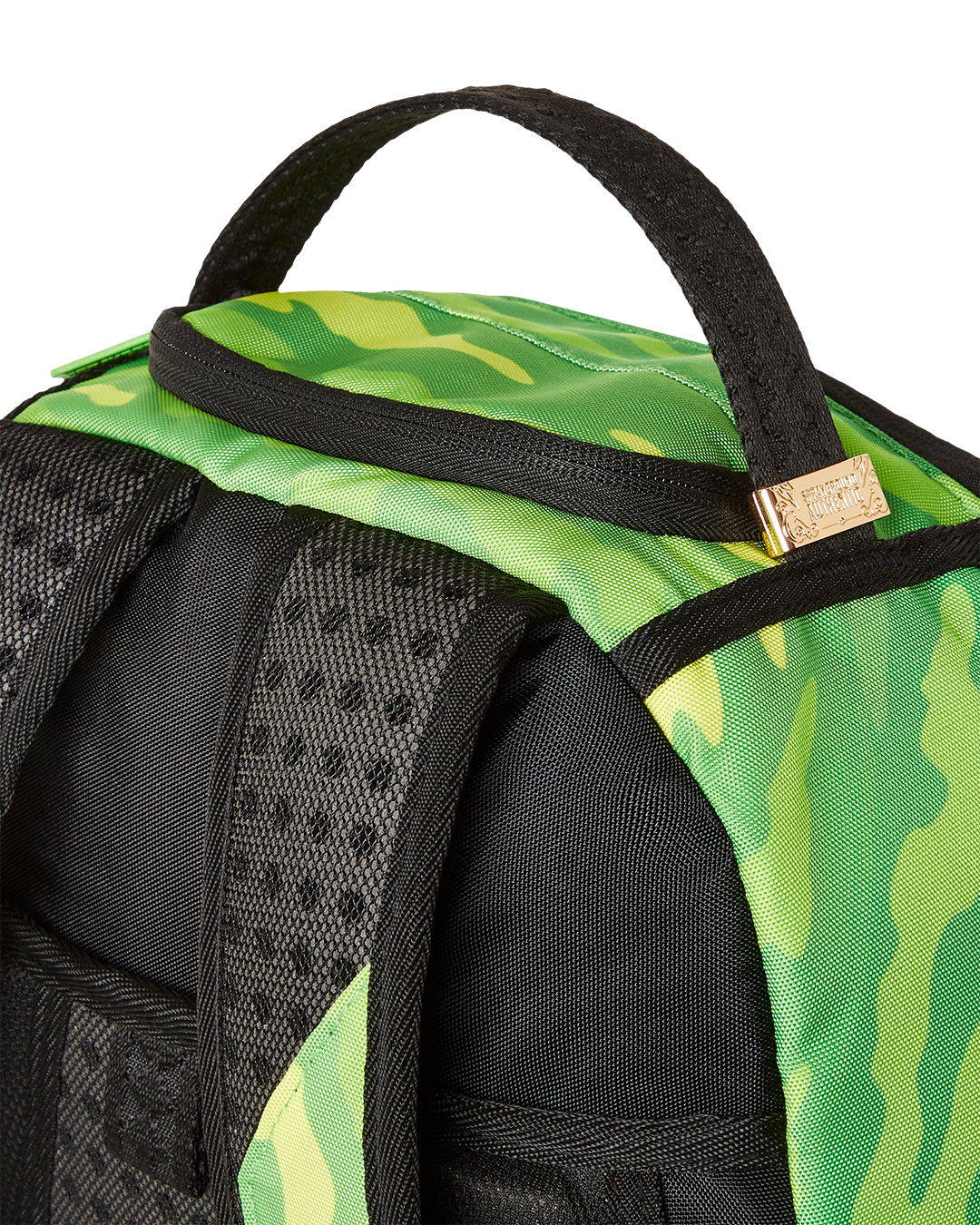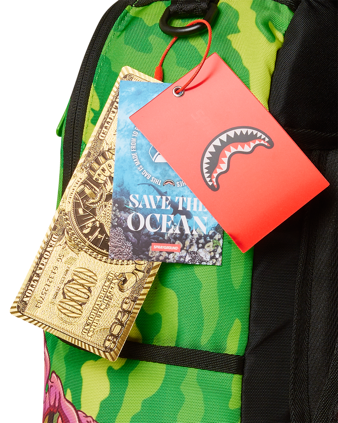Dimensions: 18" x 6" x 11.5" • Front zipper pocket • Side pockets • Zippered Stash pocket • Separate velour sunglass compartment • Ergonomic mesh back padding • Adjustable Straps for custom sizing • Gold zippers with metal hardware • Metal "Sprayground Authentic" badge • Slide through back sleeve connects to carry-on luggage to free your hands