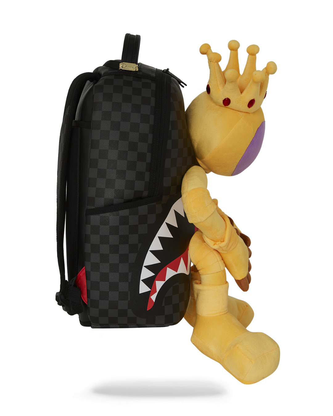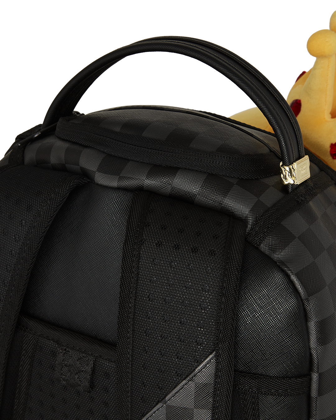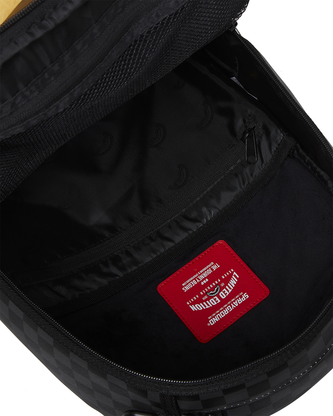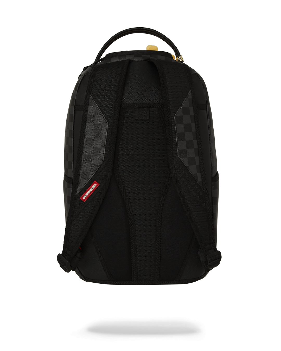 Dimensions: 18" x 6" x 11.5" • Front zipper pocket • Side pockets • Zippered Stash pocket • Separate velour sunglass compartment • Ergonomic mesh back padding • Adjustable Straps for custom sizing • Gold zippers with metal hardware • Metal "Sprayground Authentic" badge • Slide through back sleeve connects to carry-on luggage to free your hands