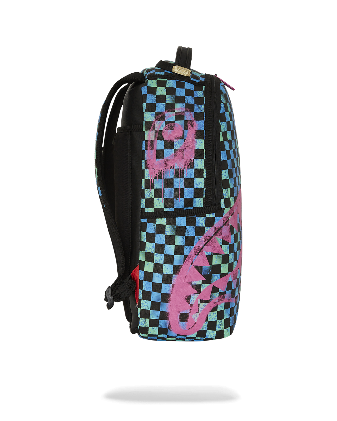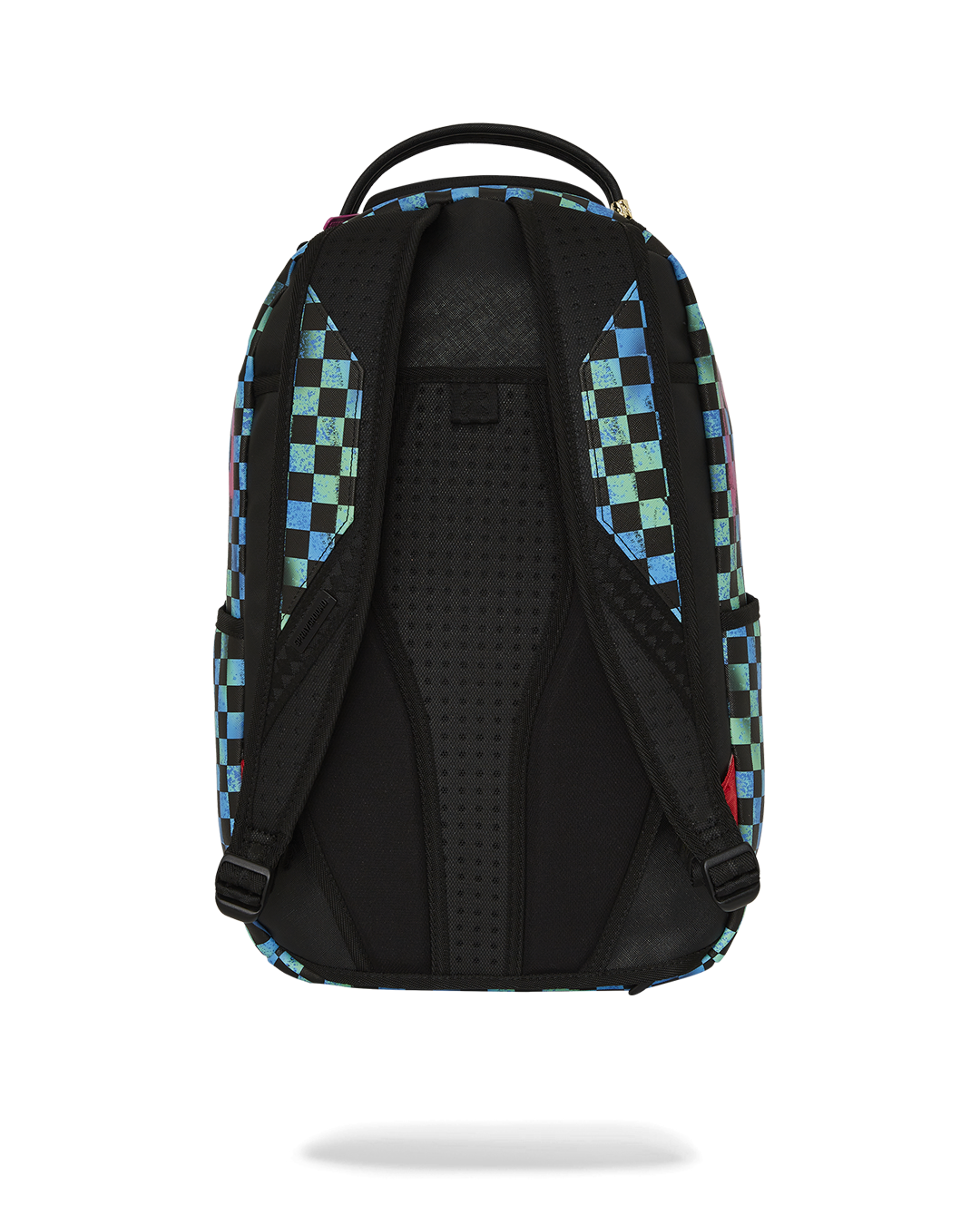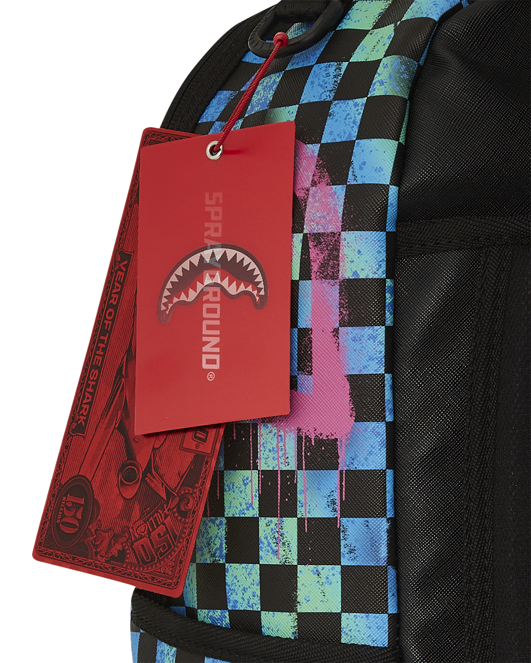 Dimensions: 18" x 6" x 11.5" • Front zipper pocket • Side pockets • Zippered Stash pocket • Separate velour sunglass compartment • Ergonomic mesh back padding • Adjustable Straps for custom sizing • Gold zippers with metal hardware • Metal "Sprayground Authentic" badge • Slide through back sleeve connects to carry-on luggage to free your hands