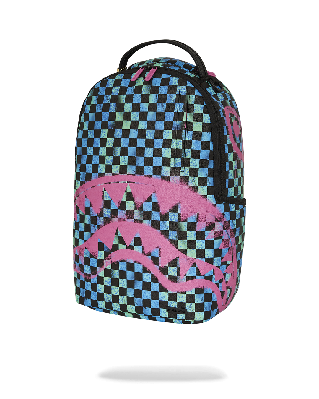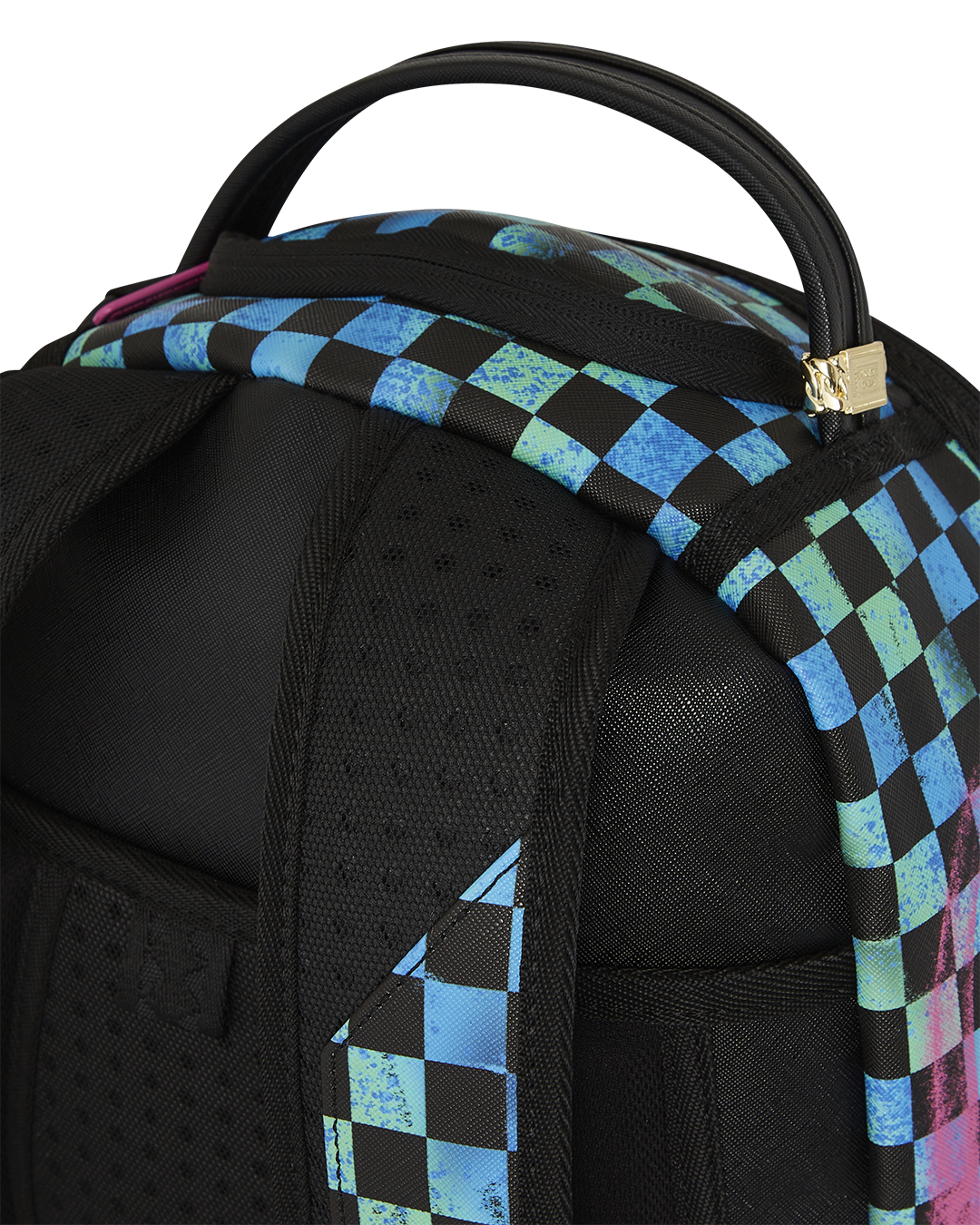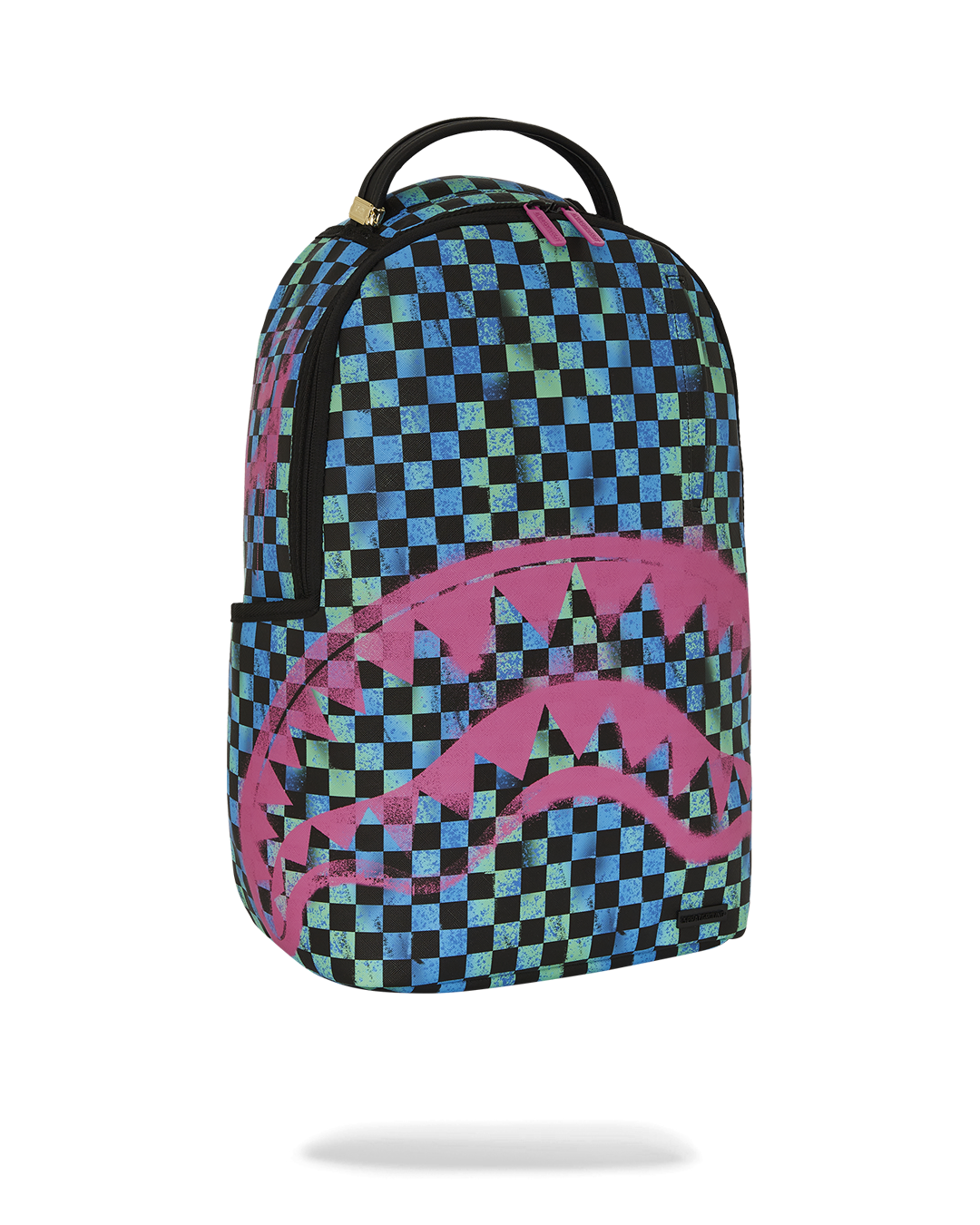 Dimensions: 18" x 6" x 11.5" • Front zipper pocket • Side pockets • Zippered Stash pocket • Separate velour sunglass compartment • Ergonomic mesh back padding • Adjustable Straps for custom sizing • Gold zippers with metal hardware • Metal "Sprayground Authentic" badge • Slide through back sleeve connects to carry-on luggage to free your hands