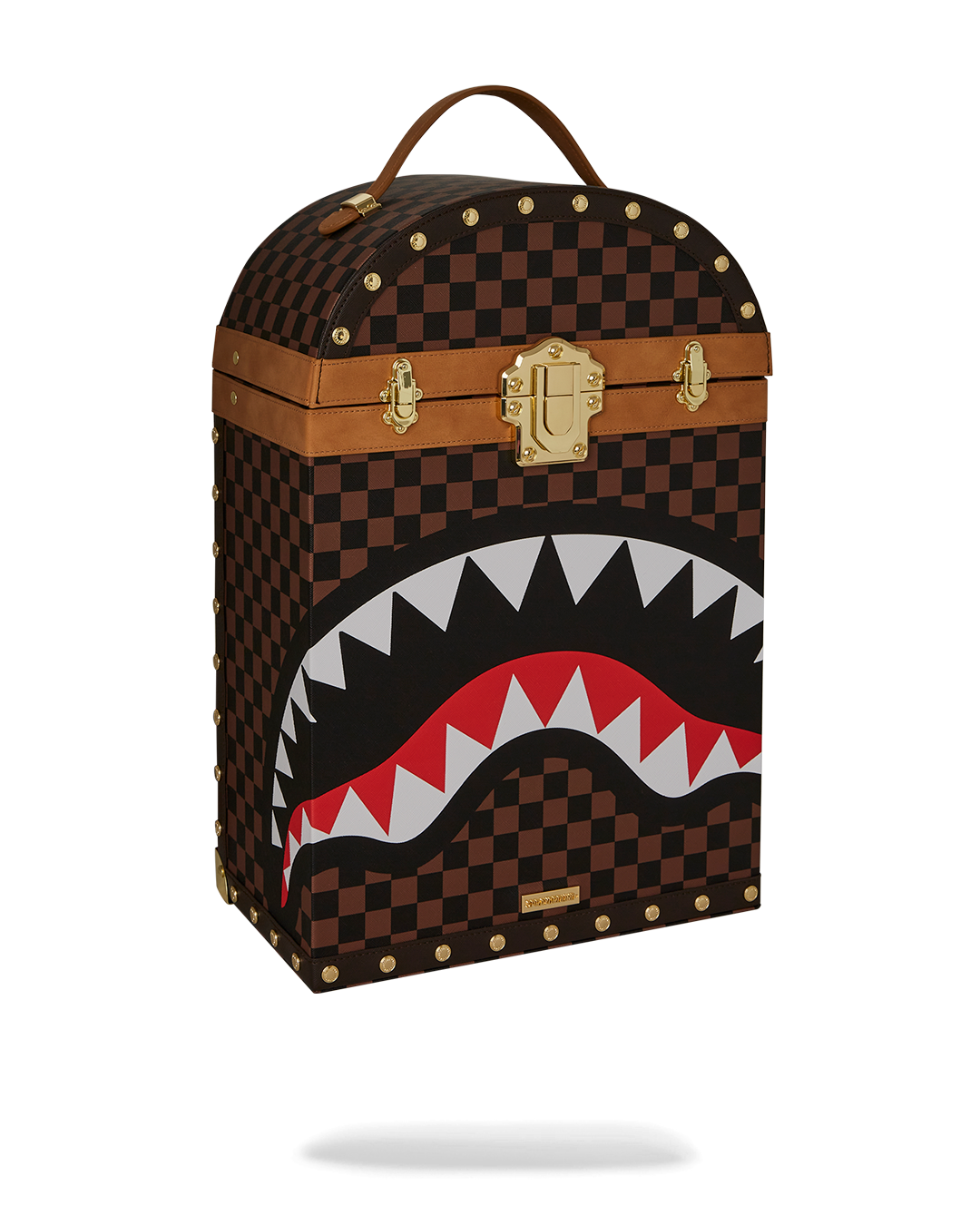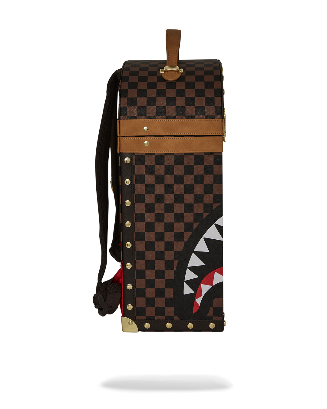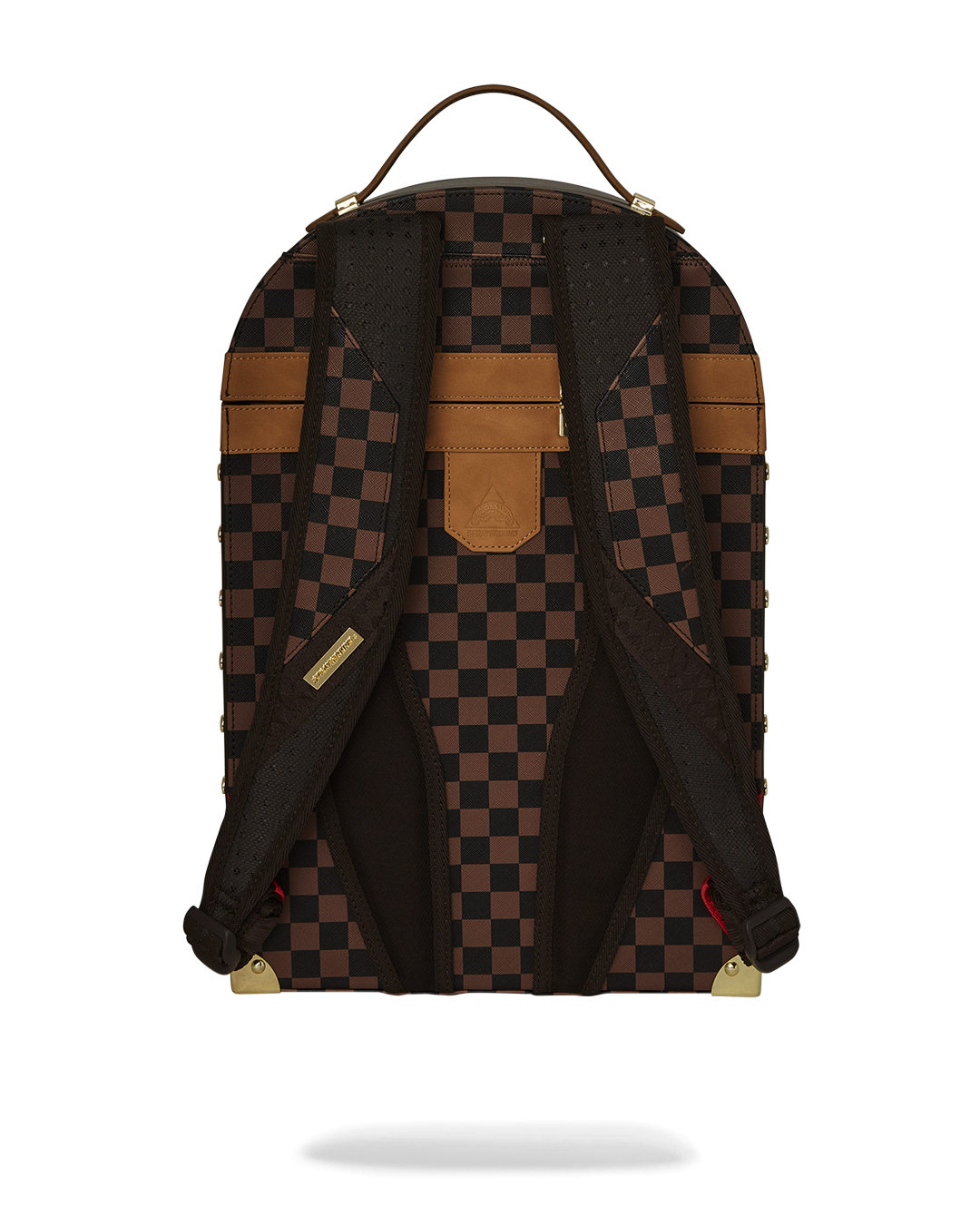 | Hard-shelled check PVC-lined trunk backpack. PVC leather applique detailing with embossed metal flat studs. PVC leather handle. Brass hardware including a brass lock. Three inner pockets for storage. |