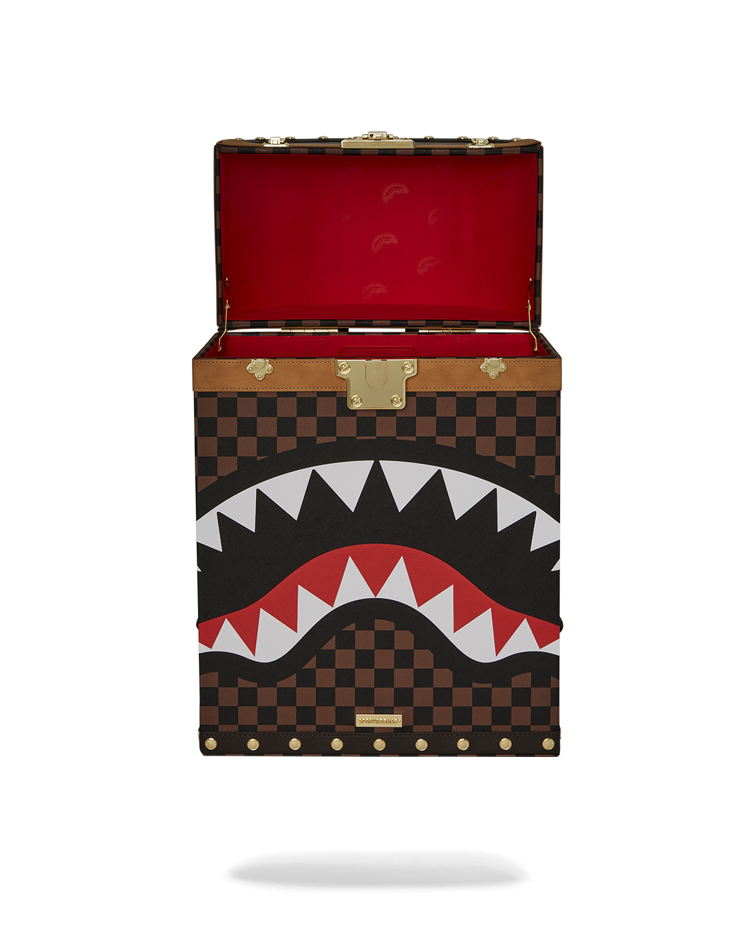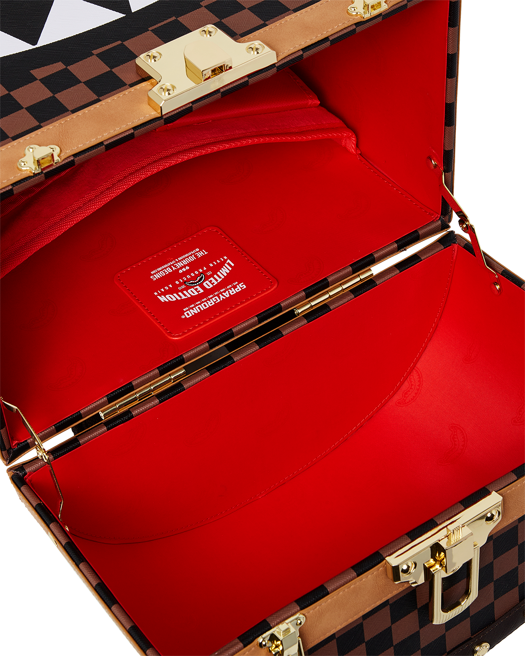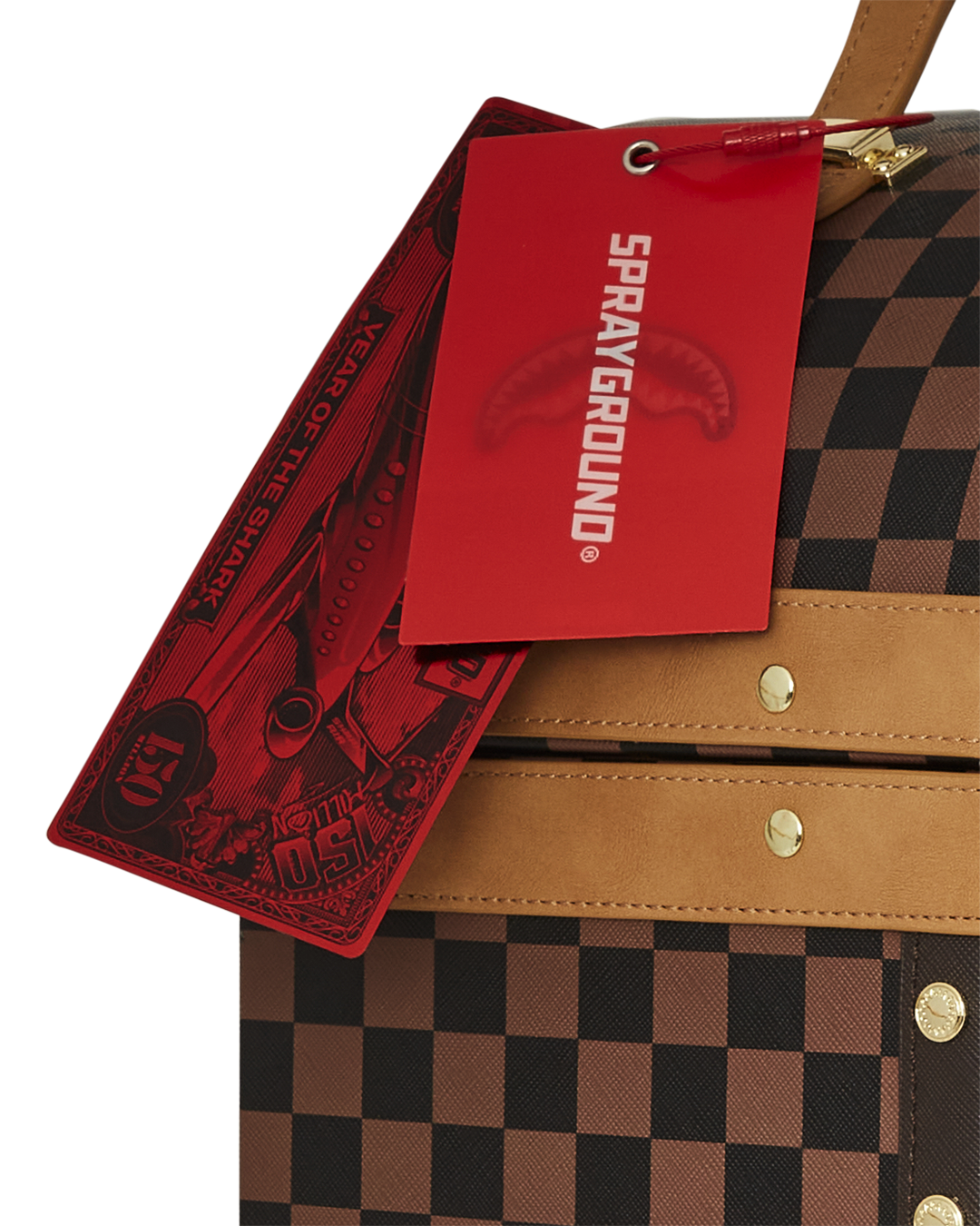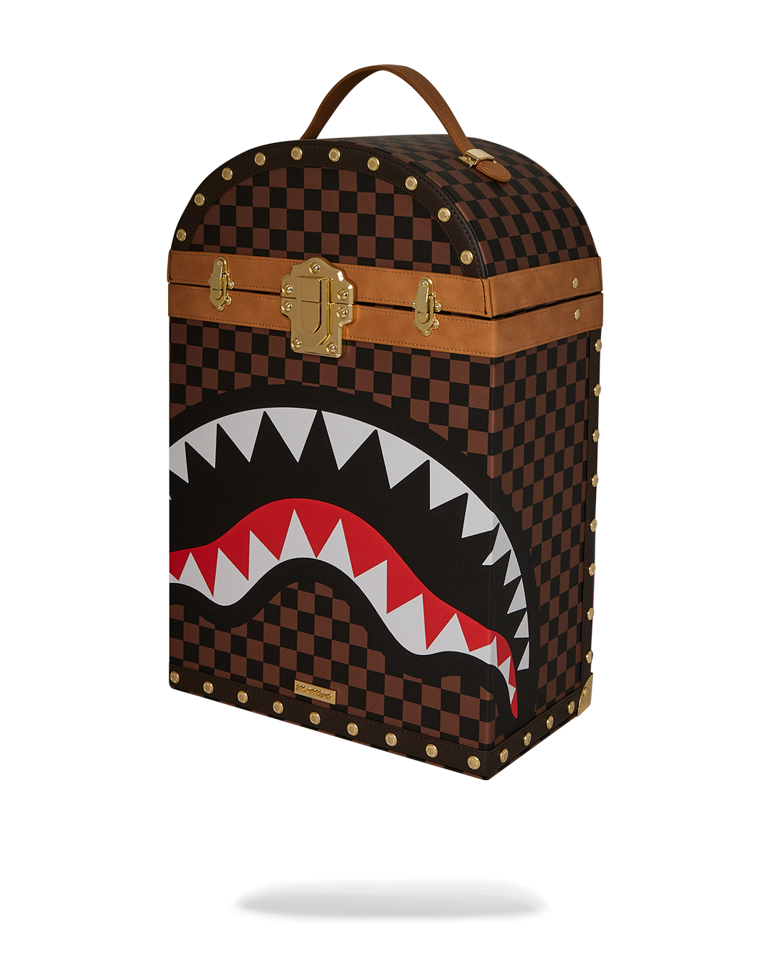 | Hard-shelled check PVC-lined trunk backpack. PVC leather applique detailing with embossed metal flat studs. PVC leather handle. Brass hardware including a brass lock. Three inner pockets for storage. |