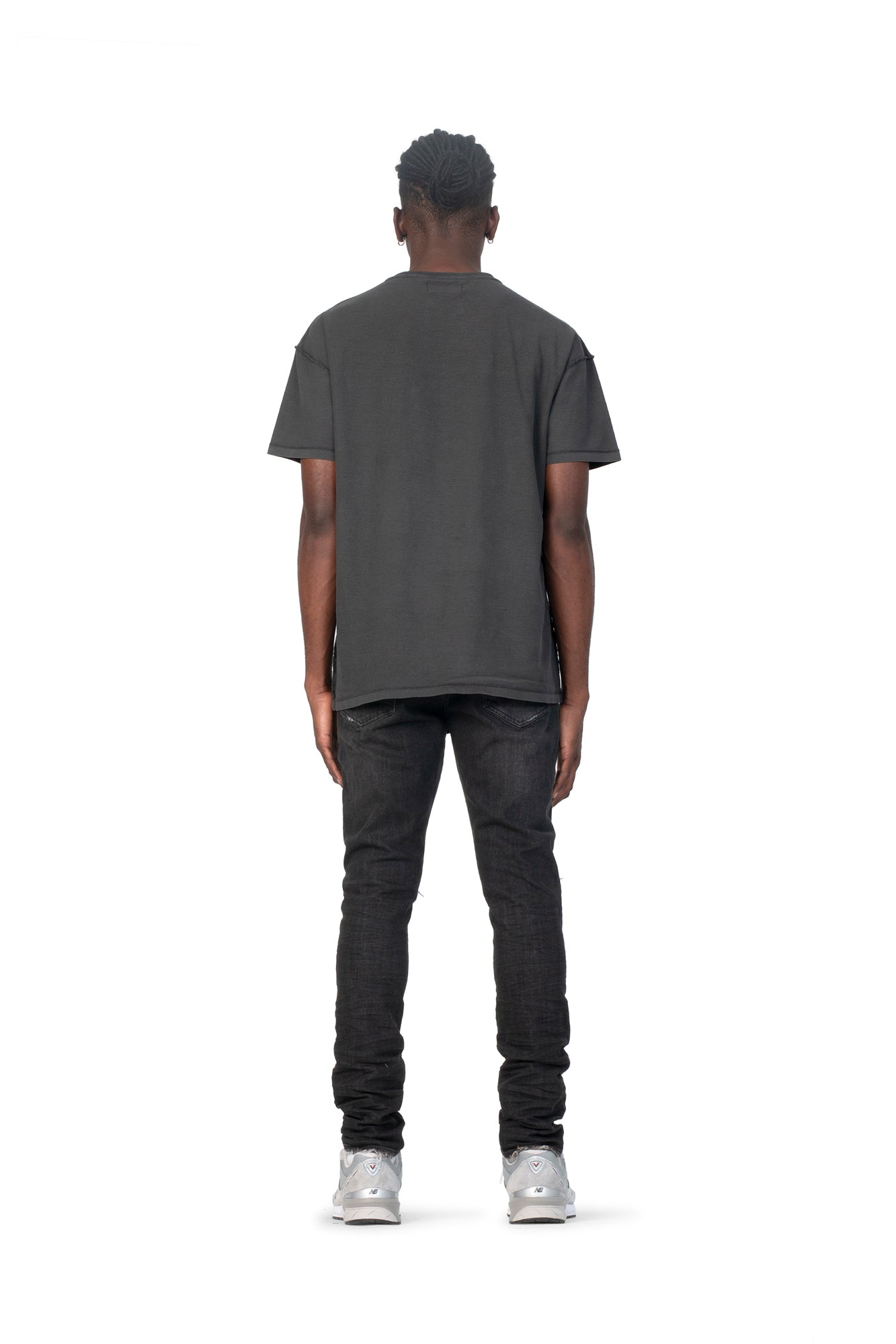 Constructed in a dark black wash, this elevated denim is designed with blowout detailing at the knees, 3D wrinkle treatment, light abrasion at the pockets and hem and finished with hand-applied paint splatter for a distressed vintage look.