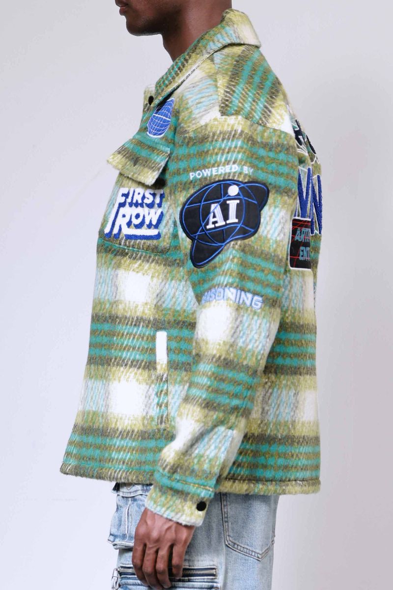 A relaxed fit shirt jacket with wool-blended fabric body. Featuring unique multi patches with chain stitches with a snap button center front closure.