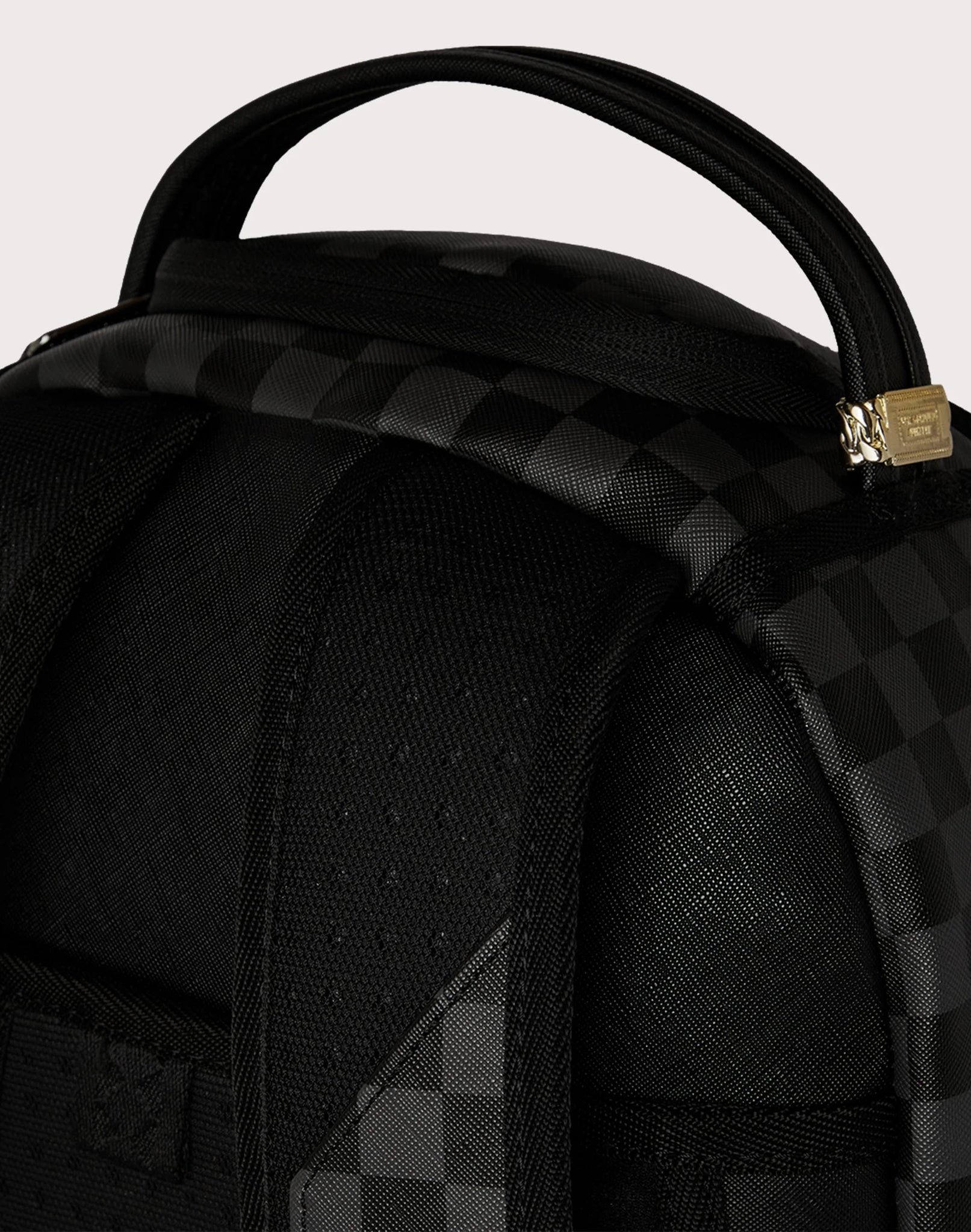 Dimensions: 18" x 6" x 11.5" • Front zipper pocket • Side pockets • Zippered Stash pocket • Separate velour sunglass compartment • Ergonomic mesh back padding • Adjustable Straps for custom sizing • Gold zippers with metal hardware • Metal "Sprayground Authentic" badge • Slide through back sleeve connects to carry-on luggage to free your hands
