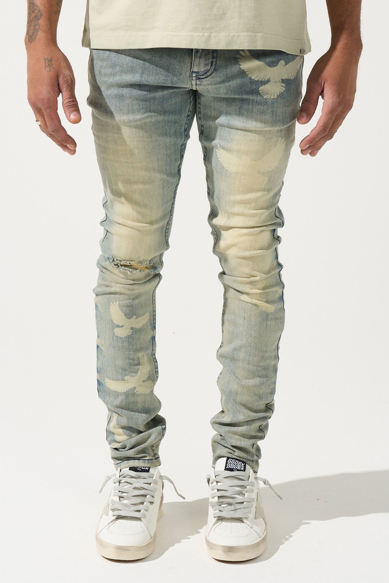 The "PEACE" jeans feature a vintage earth wash with a skinny fit. A Dove print along the legs. Fading and distressing throughout. Five-pocket styling. Leather logo patch at back waistband. Zip-fly. Tonal stitching. 5 1/2" W leg opening. SERENEDE® branded button and rivet hardware.