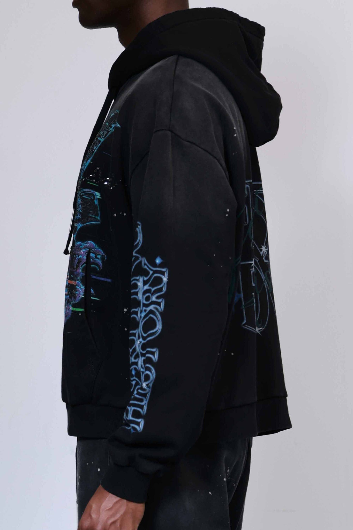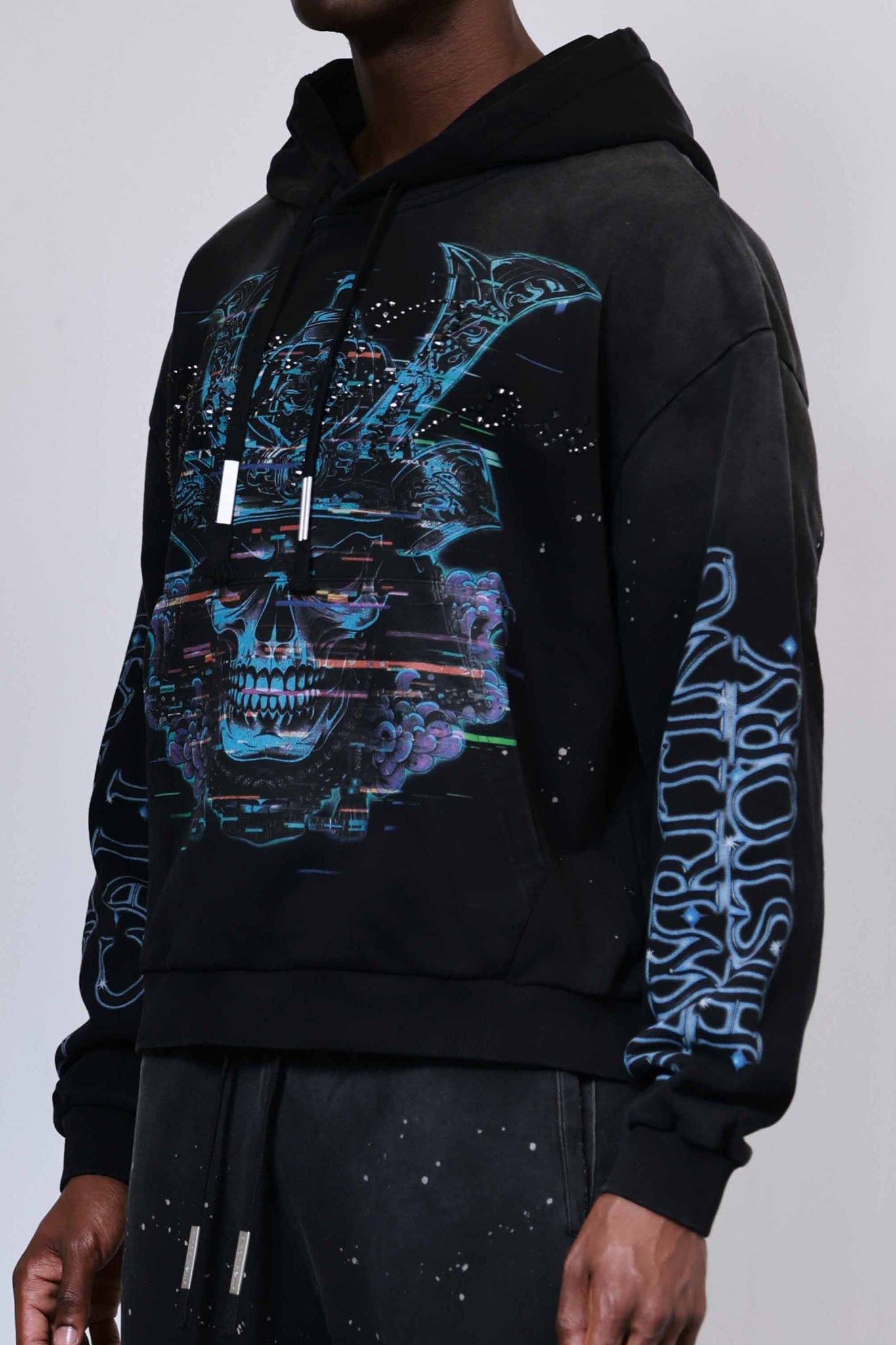 Heavy washed cropped sweat hoodie with shiny rhinestone. Featuring cropped silhouette with cozy feel, rib-knit banding at the cuffs hem for a comfortable fit, kanga pocket, and complete with an adjustable drawstring hoodie.