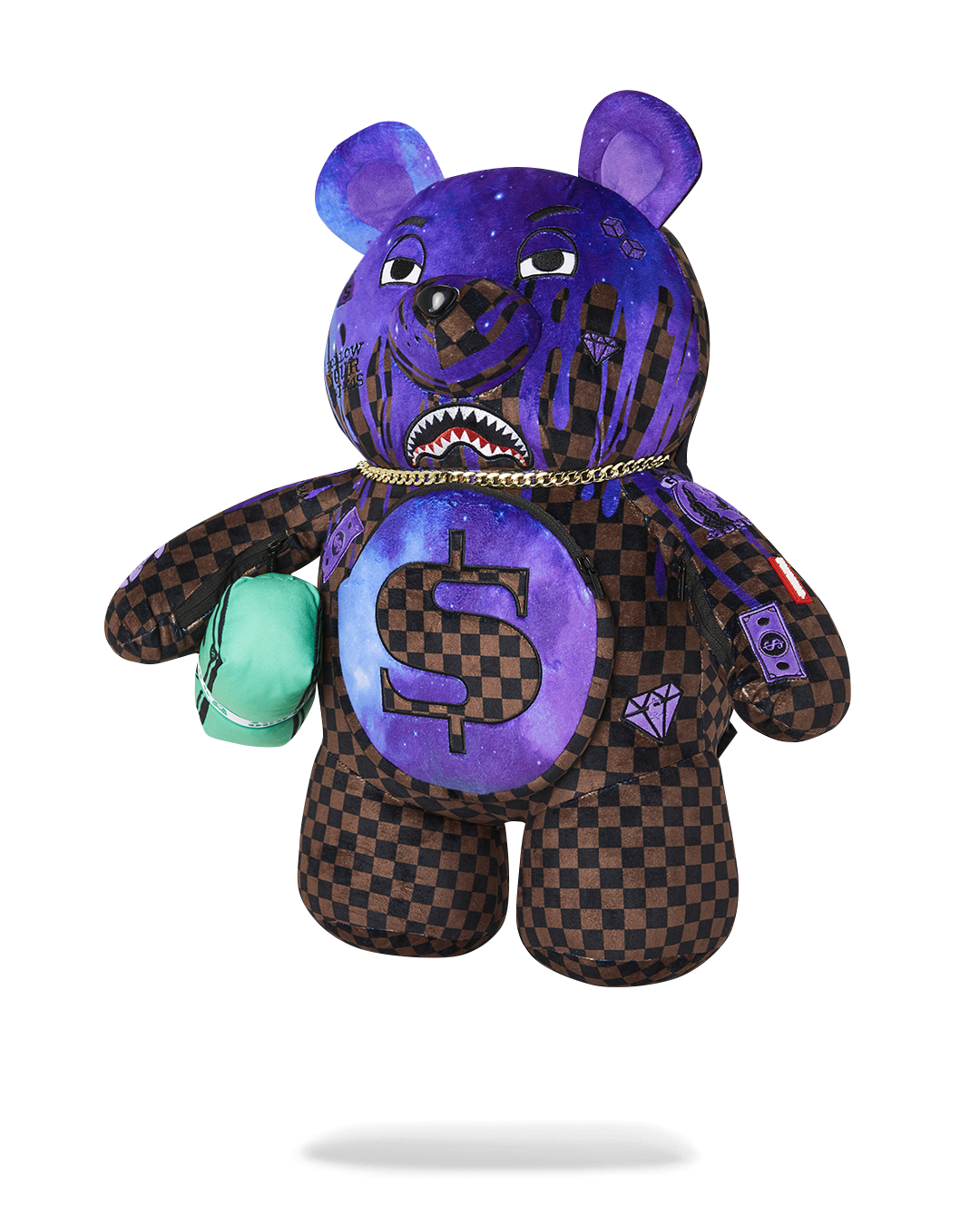 Dimensions: 18" x 6" x 11.5" • Front zipper pocket • Side pockets • Zippered Stash pocket • Separate velour sunglass compartment • Ergonomic mesh back padding • Adjustable Straps for custom sizing • Gold zippers with metal hardware • Metal "Sprayground Authentic" badge • Slide through back sleeve connects to carry-on luggage to free your hands