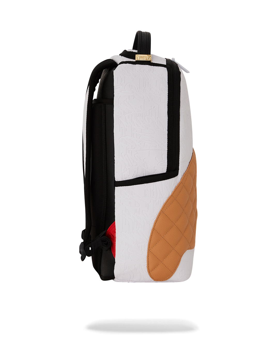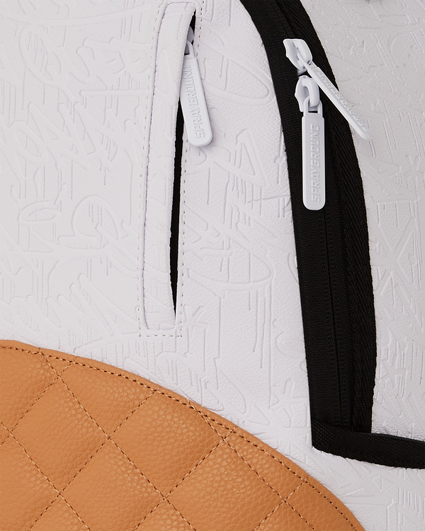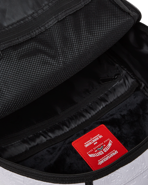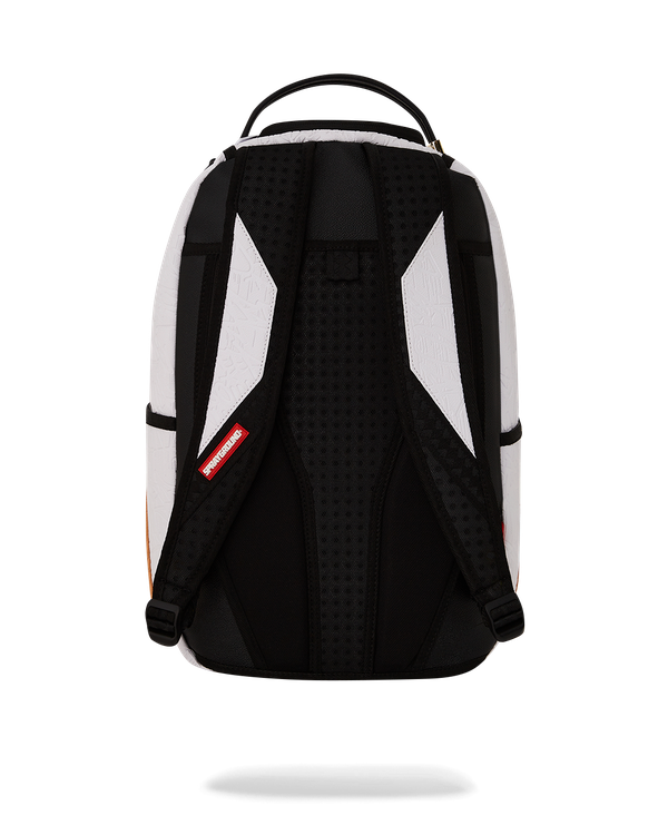 Dimensions: 18" x 6" x 11.5" • Front zipper pocket • Side pockets • Zippered Stash pocket • Separate velour sunglass compartment • Ergonomic mesh back padding • Adjustable Straps for custom sizing • Gold zippers with metal hardware • Metal "Sprayground Authentic" badge • Slide through back sleeve connects to carry-on luggage to free your hands